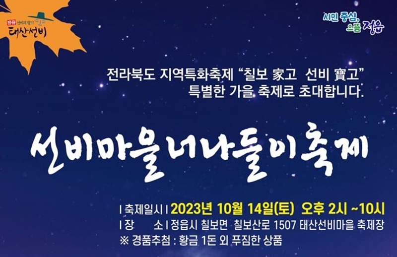 [정읍=뉴전북] 정읍시는 13일부터 15일까지 칠보면 태산선비마을 일원에서 ‘칠보 가고 선비 보고 축제’를 개최한다.