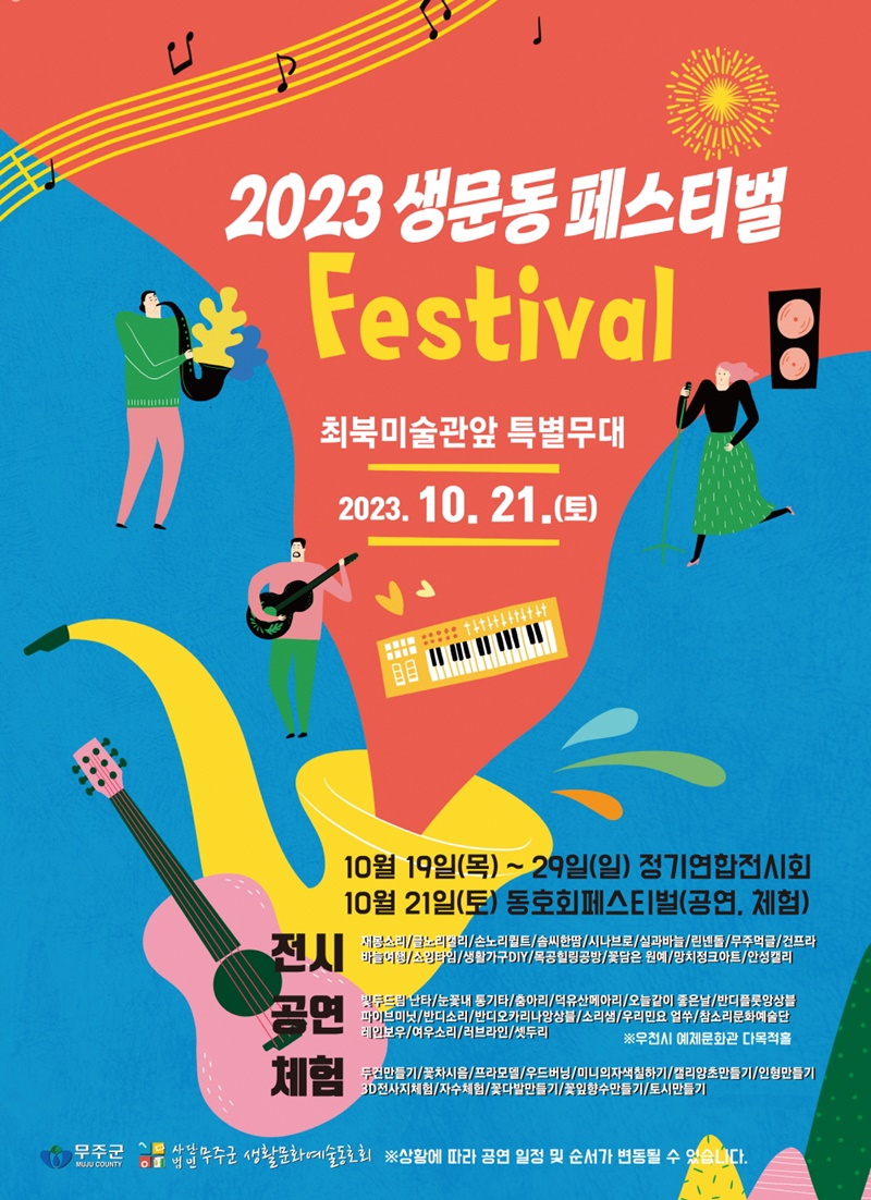 [무주=뉴전북] 무주군은 오는 21일 토요일 오후 2시부터 최북미술관 기획전시실 및 광장(특별무대)에서 생활문화예술동호회 페스티벌을 개최한다고 밝혔다.