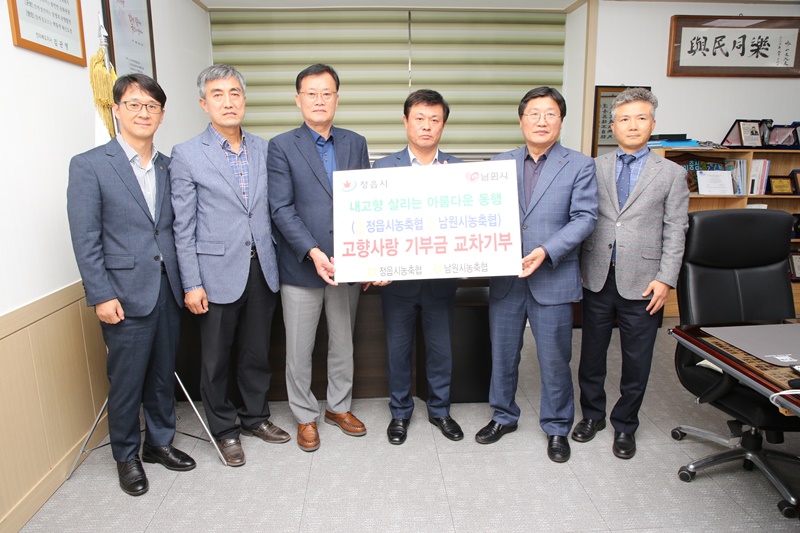 [정읍=뉴전북] 정읍시와 남원시 농축협 조합장들이 고향사랑기부제 활성화와 지역 간 상생발전을 위해 지난 17일 정읍시청에서 고향사랑기부금 350만원을 상호 기부했다.