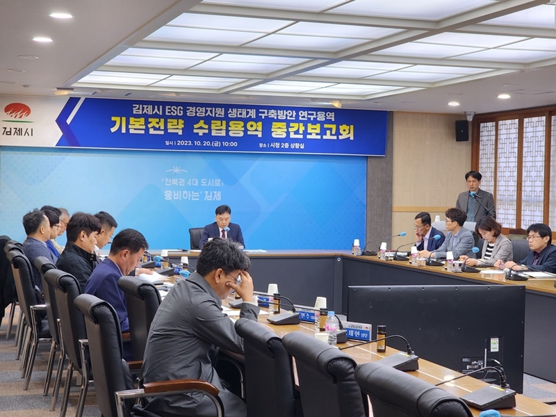[김제=뉴전북] 김제시는 지난 20일 2층 상황실에서 이찬준 부시장 주재로 관내 기업체 대표 및 관계 공무원 등 20여 명이 참석한 가운데 ESG 관내 기업 경영지원 생태계 구축방안 연구용역 중간보고회를 개최했다.