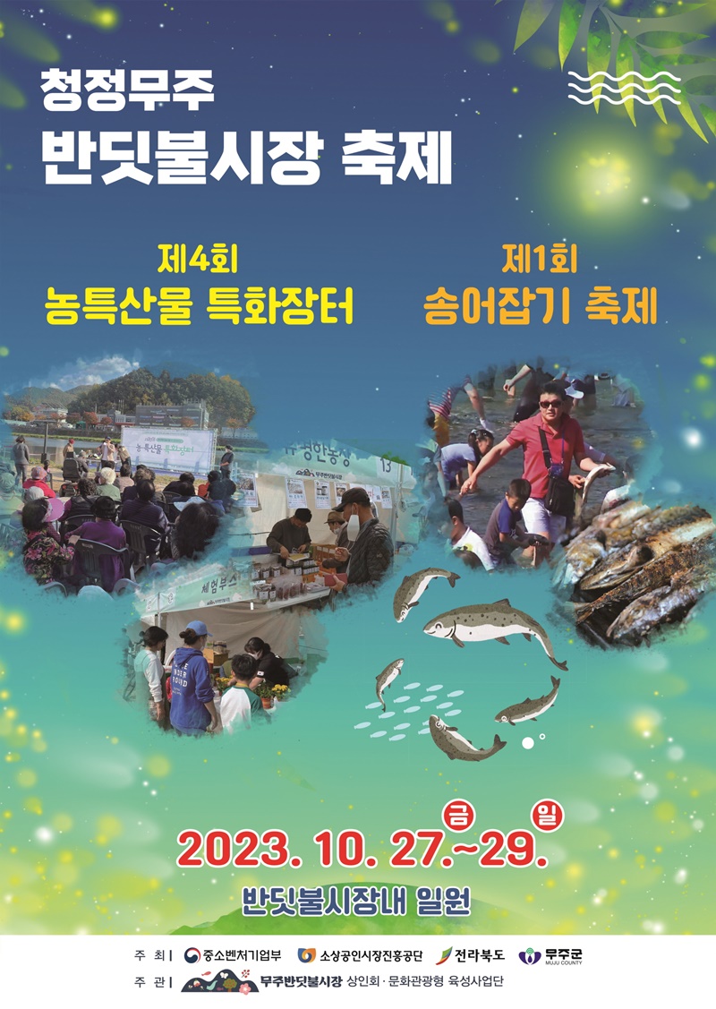 무주군청 산업경제과 이승하 과장은 “2023년 전통시장 및 상점가 활성화 유공 국무총리상을 수상한 것을 비롯해 ‘가족들과 방문하기 좋을 전통시장 17곳’ 등에도 선정이 된 무주반딧불시장의 면모를 다시 한번 보여줄 기회이자 전통시장이 재밌고 가볼만한 곳이라는 인식을 심는 아주 좋은 계기가 될 것”이라며 “무주반딧불시장 축제에 꼭 오셔서 가을걷이로 풍성해진 시골장의 정취도 느껴보시고 무주반딧불농특산물의 우수성, 무주반딧불시장의 매력도 꼭 경험해보시라”고 전했다.