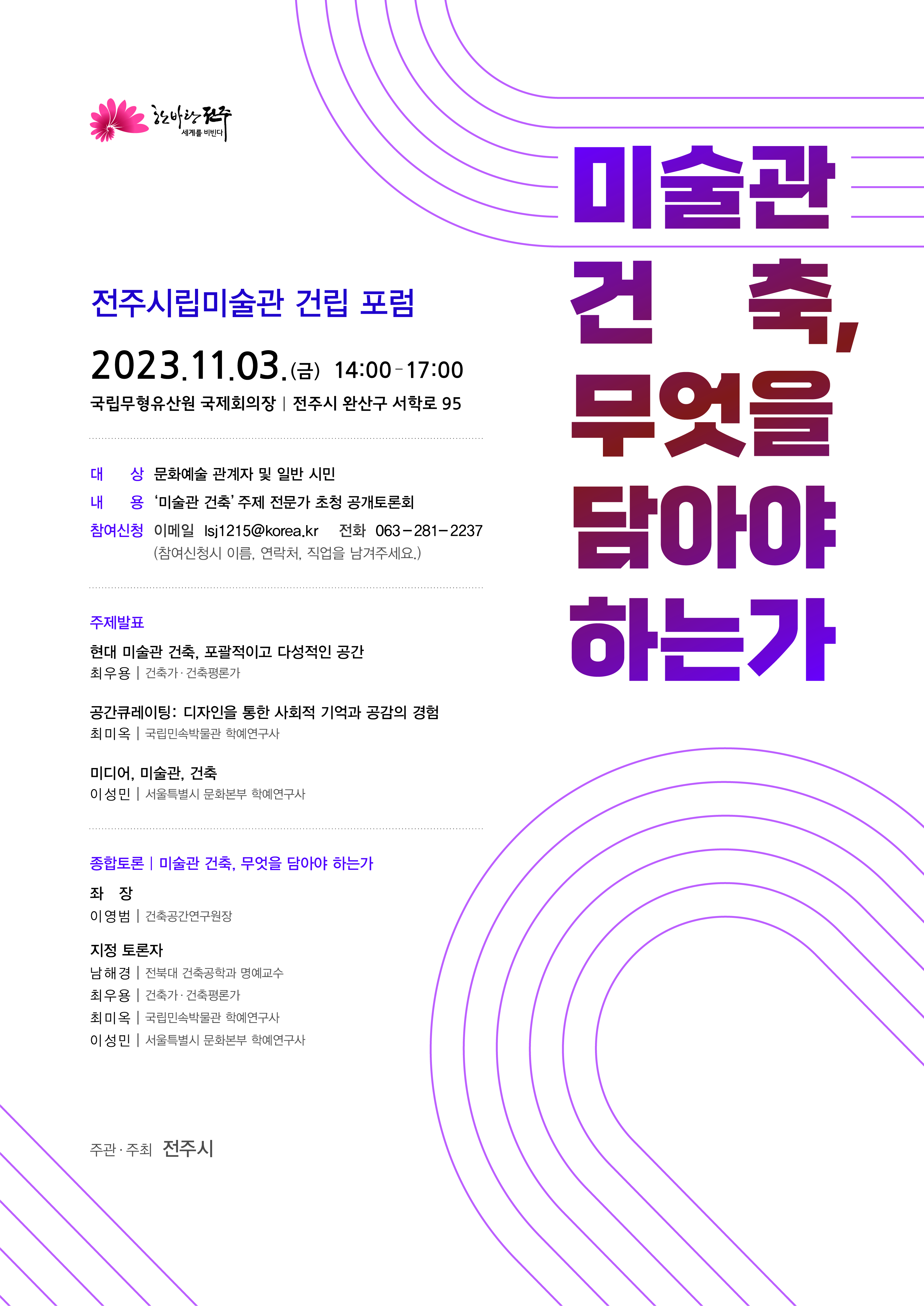 시는 오는 3일 오후 2시 국립무형유산원 국제회의장에서 ‘미술관 건축’을 주제로 ‘전주시립미술관 건립 준비 포럼’을 개최한다.