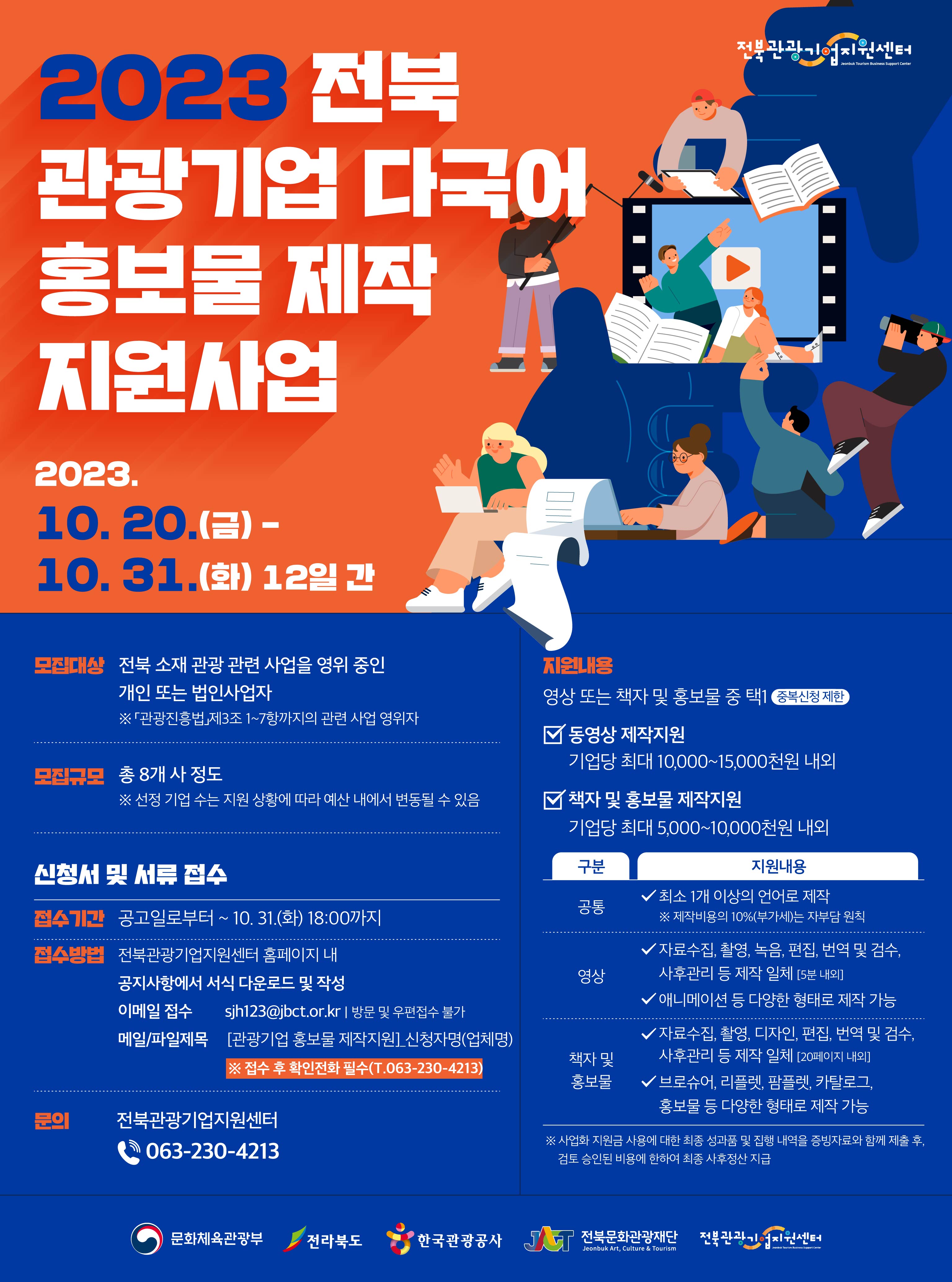 [문화=뉴전북] 전북도와 전북문화관광재단(대표이사 이경윤, 이하 재단) 관광기업지원센터는 지난 20일부터 오는 31일까지 ‘2023 전북 관광기업 다국어 홍보물 제작 지원사업’ 참여기업을 모집한다.