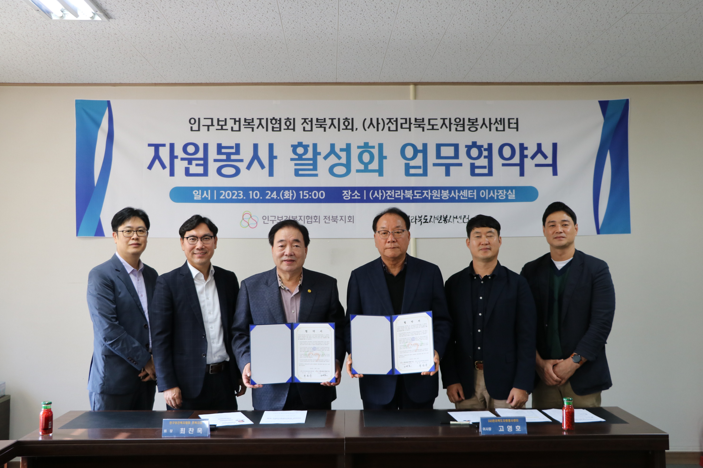 [도정=뉴전북] 인구보건복지협회 전북지회(회장 최찬욱)와 (사)전라북도 자원봉사센터(이사장 고영호)는 지난 24일(화) 전북자원봉사센터 이사장실에서 자원봉사자 의료지원 및 자원봉사 활성화를 위한 업무협약을 가졌다.