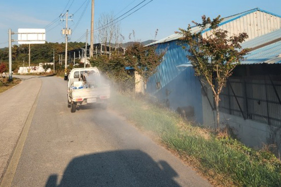 또한 지역 내 오염원 유입 차단을 위해 외부 축산차량 소독 강화 및 축협 공동방제단 2개 반과 군 방역차량 1대를 동원해 방역취약 소규모 농장 축사 주변 소독도 강화했다.
