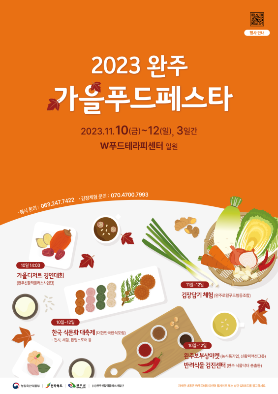 [완주=뉴전북] 가을향 담은 제철 농산물을 테마로 하는 ‘2023 완주, 가을푸드 페스타’가 전북 혁신도시 W푸드테라피센터 일원에서 오는 11월 10일부터 12일까지 3일간 열린다.