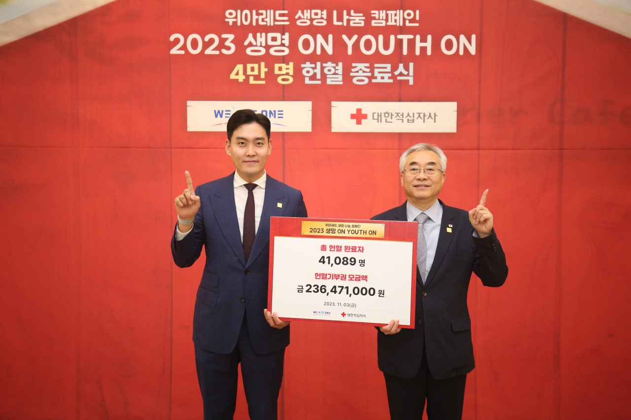 3일 경기도 수원 위너 카페에서 진행된 위아레드 생명 나눔 캠페인 2023 생명 ON YOUTH ON 4만 명 헌혈 종료식에는 위아원 홍준수 대표, 대한적십자사 조남선 혈액관리본부장 외 각 단체 관계자들이 참여했다.
