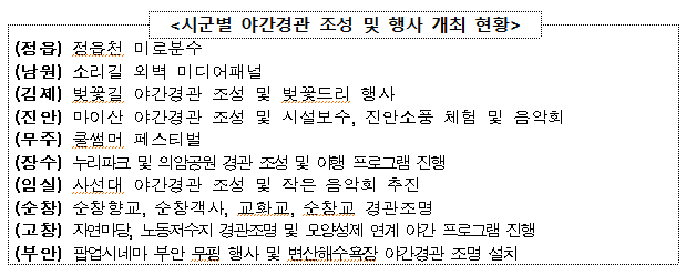 장수군은 누리파크 및 의암공원에 야간포토존, 다리 조명 등을 조성하고, 축제와 연계한 야행 프로그램을 진행했다. 김제시는 시민운동장에 바닥태양광, 터널조명 등 벚꽃길 야간경관을 조성하고 꽃빛드리 축제를 개최하였다. 이밖에도 연말까지 시군 명소에 다양한 야간 조형물 등을 설치해 특색있는 프로그램 운영 및 행사를 개최할 계획이다.