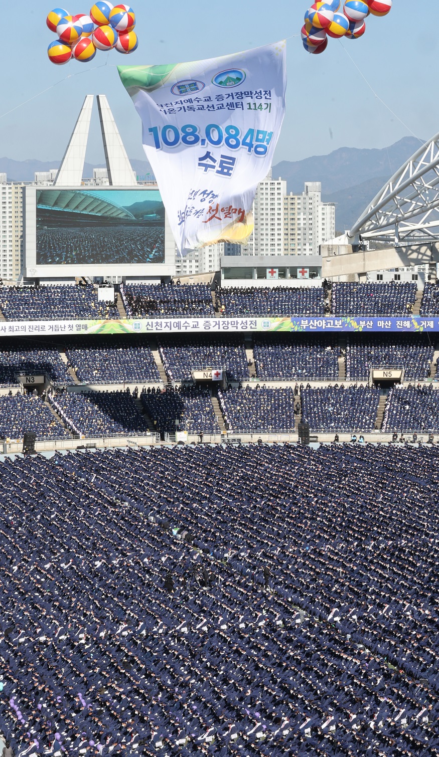신천지예수교회의 성경교육기관인 시온기독교선교센터(총원장 탄영진)는 이날 대구스타디움에서 신천지 12지파 시온기독교선교센터 114기 수료식을 개최했다. 이번 10만 수료식에서 배출한 수료생은 총 108084명이다. 2019103764, 2022106186명에 이어 세 번째 10만 명 이상 수료생을 배출한 것이다.