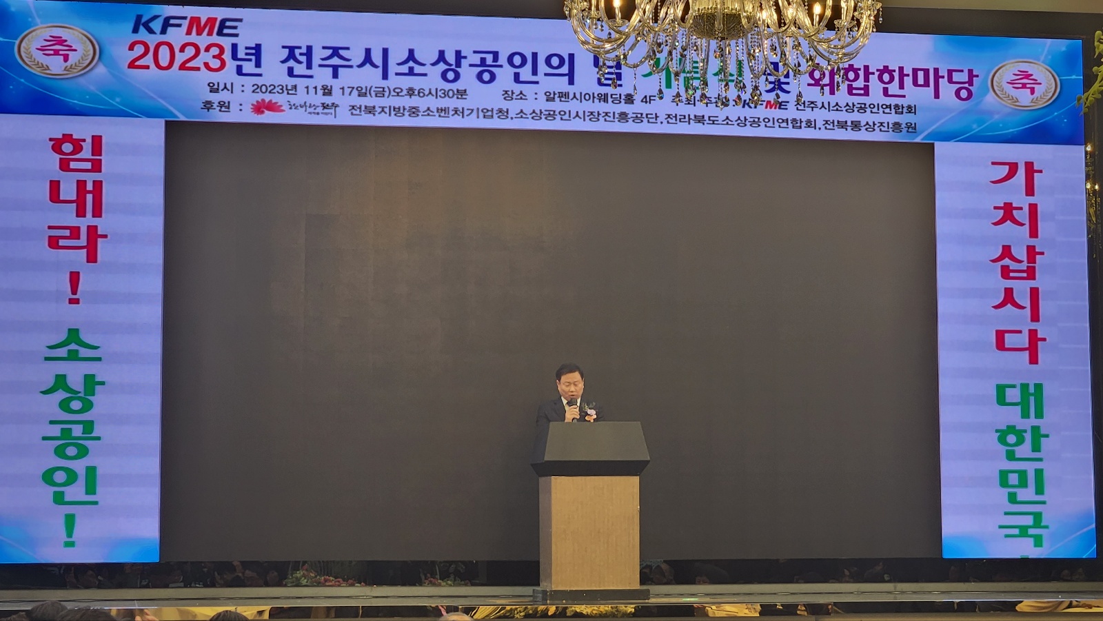 KFME 전주시소상공인연합회 주관으로 열린 이날 행사에는 우범기 전주시장과 이기동 전주시의회 의장, 국회의원 등 지역 정치권, 안태용 전북지방중소벤처기업청장, 윤여봉 전북경제통상진흥원장, 박성진 소상공인시장진흥공단 전주센터장, 전안균 전북도 소상공인연합회장, 시·군 연합회 회장, 골목상권상가번영회 회장 등이 참석했다.