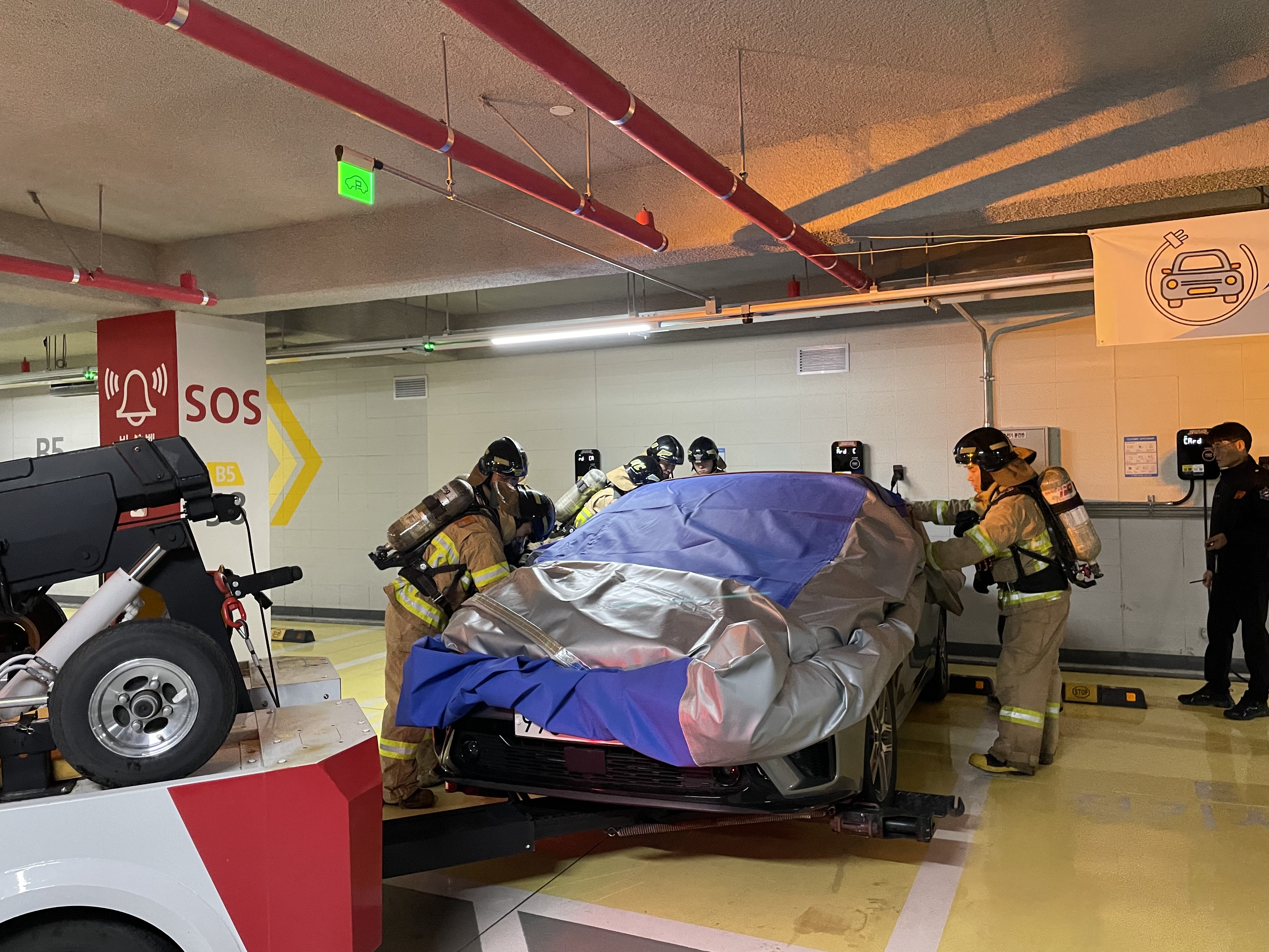 훈련은 지하 5층 전기차 충전시설의 전기차에서 화재가 발생한 상황을 가정하여 진행되었으며, 질식소화덮개 설치 진압 및 연소방지, 견인차 활용 화재 차량 이동, 지상에서의 이동식 침수조 설치 소화 순서로 진행되었다.