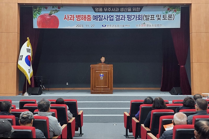 [무주=뉴전북] 무주군은 지난 27일 무주군농업기술센터 ‘농민의 집’에서 관내 사과재배 농업인 1백여 명이 참석한 가운데 ‘사과 병해충 예찰 · 방제 시범사업 평가회’를 가졌다고 밝혔다.