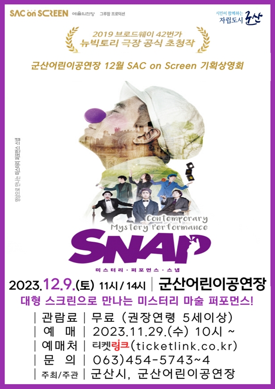 [군산=뉴전북] 군산시는 오는 9일 11시와 오후 2시, 군산어린이공연장 에서 SAC on screen ‘스냅(SNAP)’을 상영한다고 밝혔다.