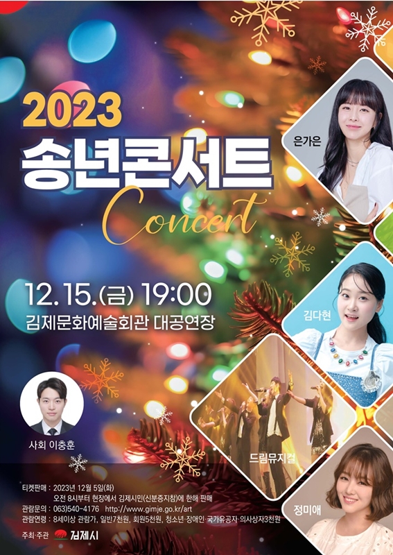 [김제=뉴전북] 김제시는 김제문화예술회관 대공연장에서 오는 15일 오후 7시 행복을 전하는 음악 ‘2023년 송년 콘서트’가 펼쳐진다.