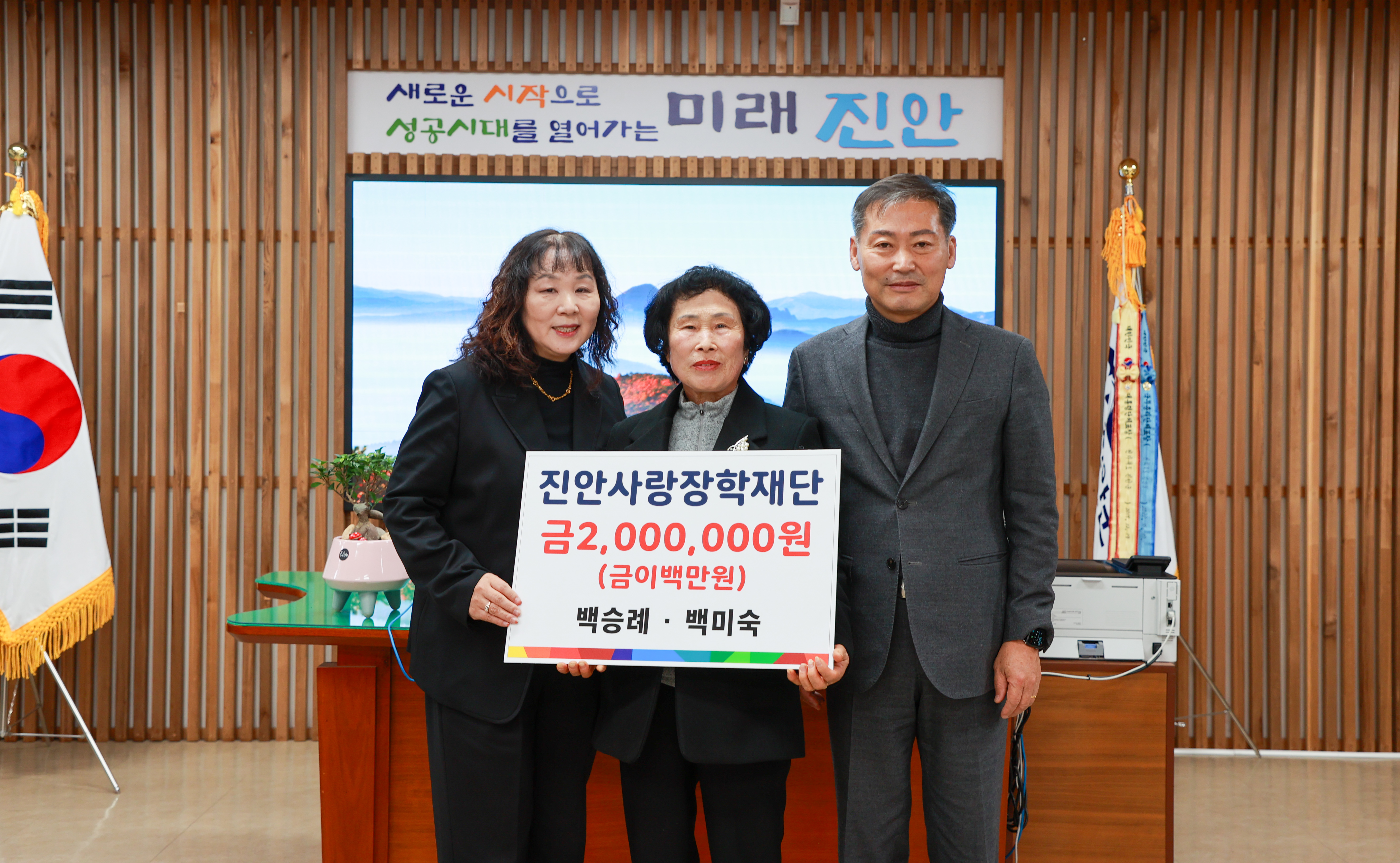 [진안=뉴전북]진안사랑장학재단(이사장 전춘성)은 1일 군수실에서 백승례, 백미숙 씨 자매가 진안사랑장학금 2백만원을 전달했다고 밝혔다.