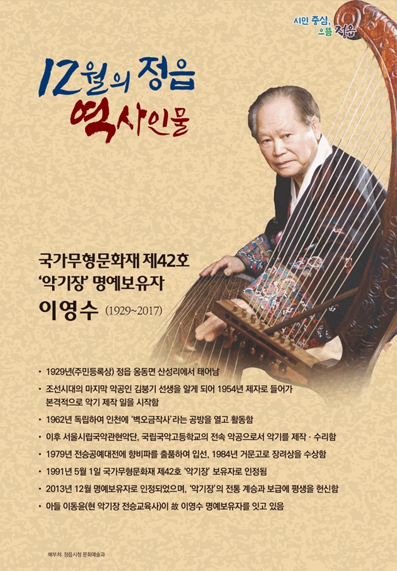 이학수 시장은 “평생을 악기를 고치고 만들며 살아온 故이영수 명예보유자가 정읍의 높은 문화적 가치를 잘 보여주고 있다”며 “앞으로도 정읍의 역사 정체성을 찾기 위해 지역 곳곳에 숨겨진 역사 인물을 지속적으로 발굴해 나가겠다”고 말했다.