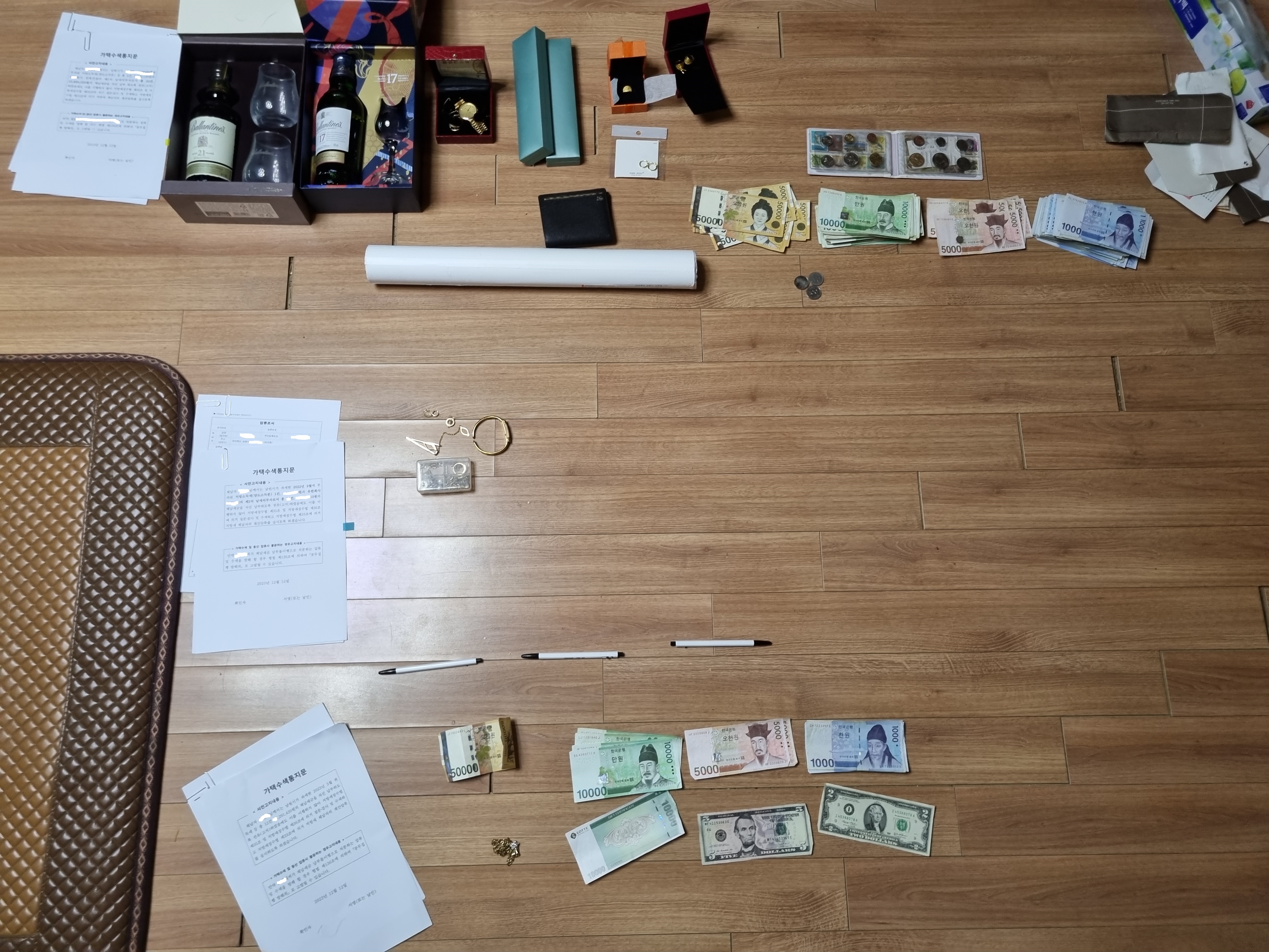 이날 체납기동팀은 도청과 관할 경찰서의 협조를 구해 체납자 A씨와 그의 자녀 체납자 B씨, 그의 자부 체납자 C씨의 가택을 수색하여 현금 239만원 가방 1개, 귀금속 9점, 양주 2점을 찾아내고 압류스티커를 부착했다.