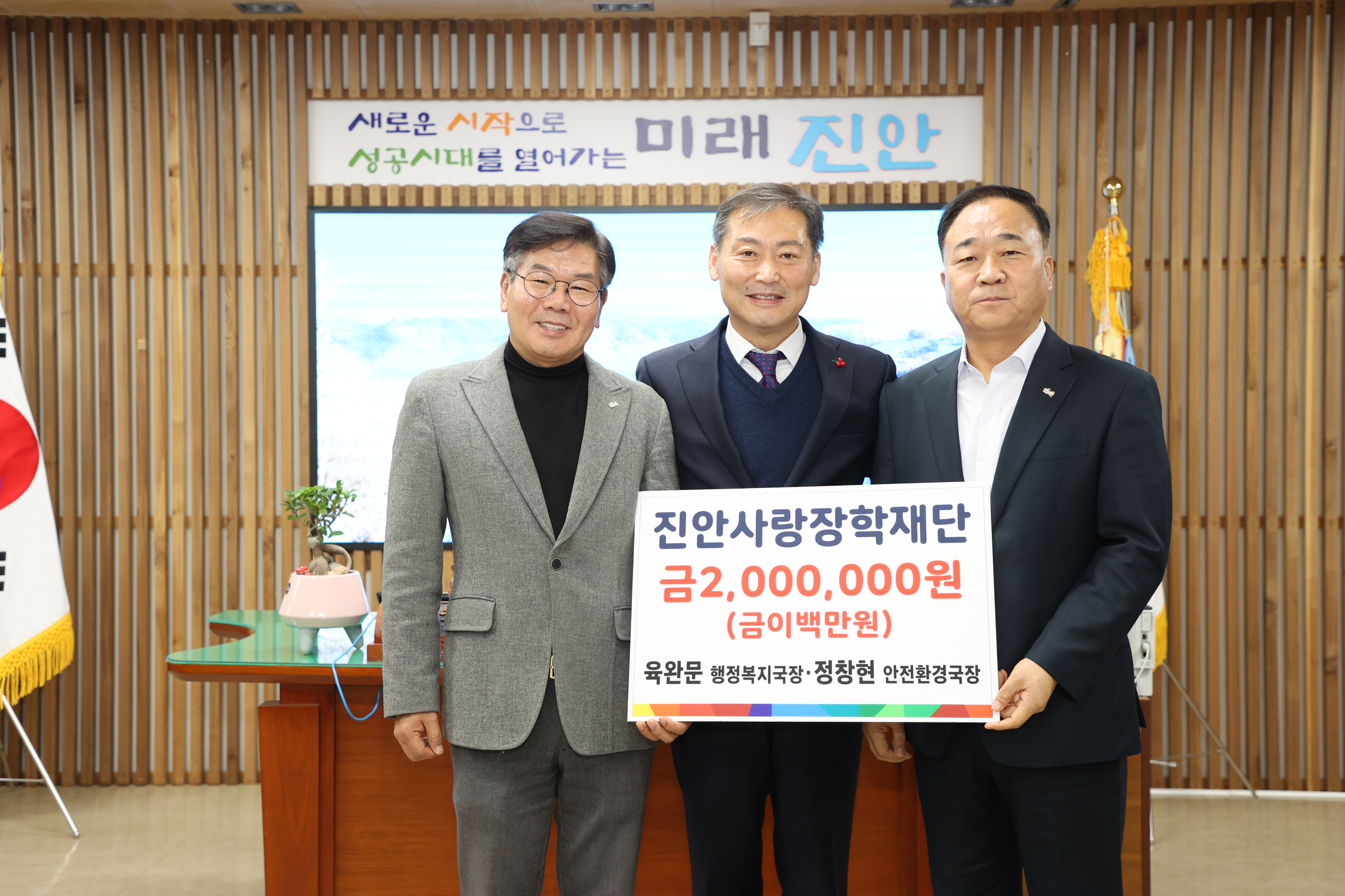 [진안=뉴전북]진안사랑장학재단(이사장 전춘성)은 15일 군수실에서 진안군청 육완문 행정복지국장과 정창현 안전환경국장이 장학금 2백만원을 기탁했다고 밝혔다.