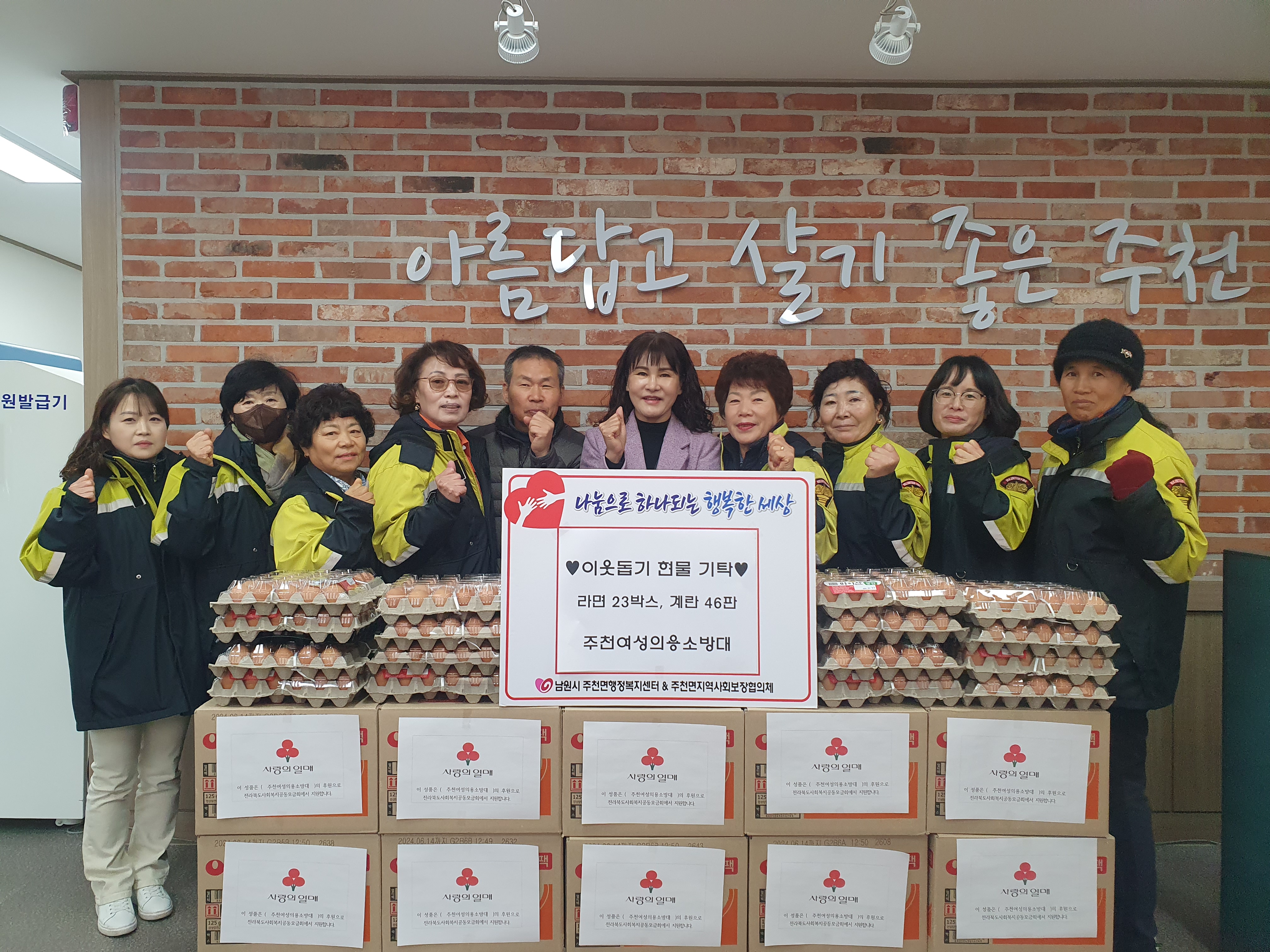 [남원=뉴전북] 남원시 주천면 여성의용소방대는 18일, 라면 23박스와 달걀 46판을 관내 경로당 어르신들에게 전달하였다.