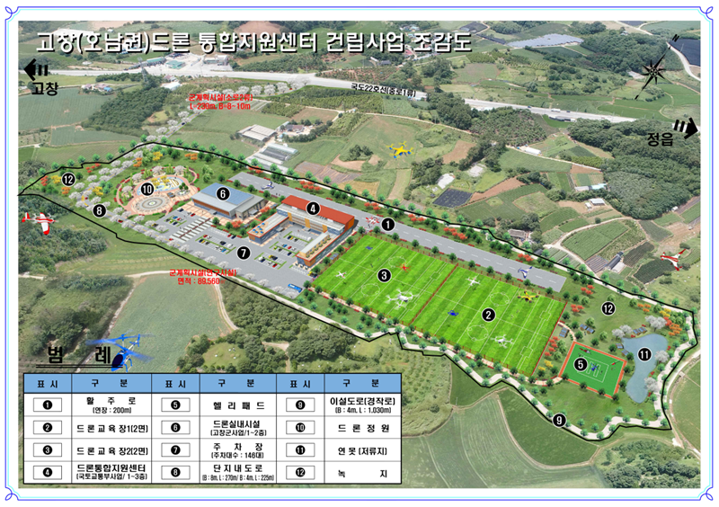 ‘고창(호남권) 드론통합지원센터’는 고창군 성내면 조동리 184-4번지 일원에 8만9560㎡(약2만7000평) 규모로 드론통합지원센터(비행시험·드론자격·드론교육), 활주로(200m×20m), 및 실기시험장(90m×40m×4면) 등을 구축한다. 총사업비는 375억원에 달한다.