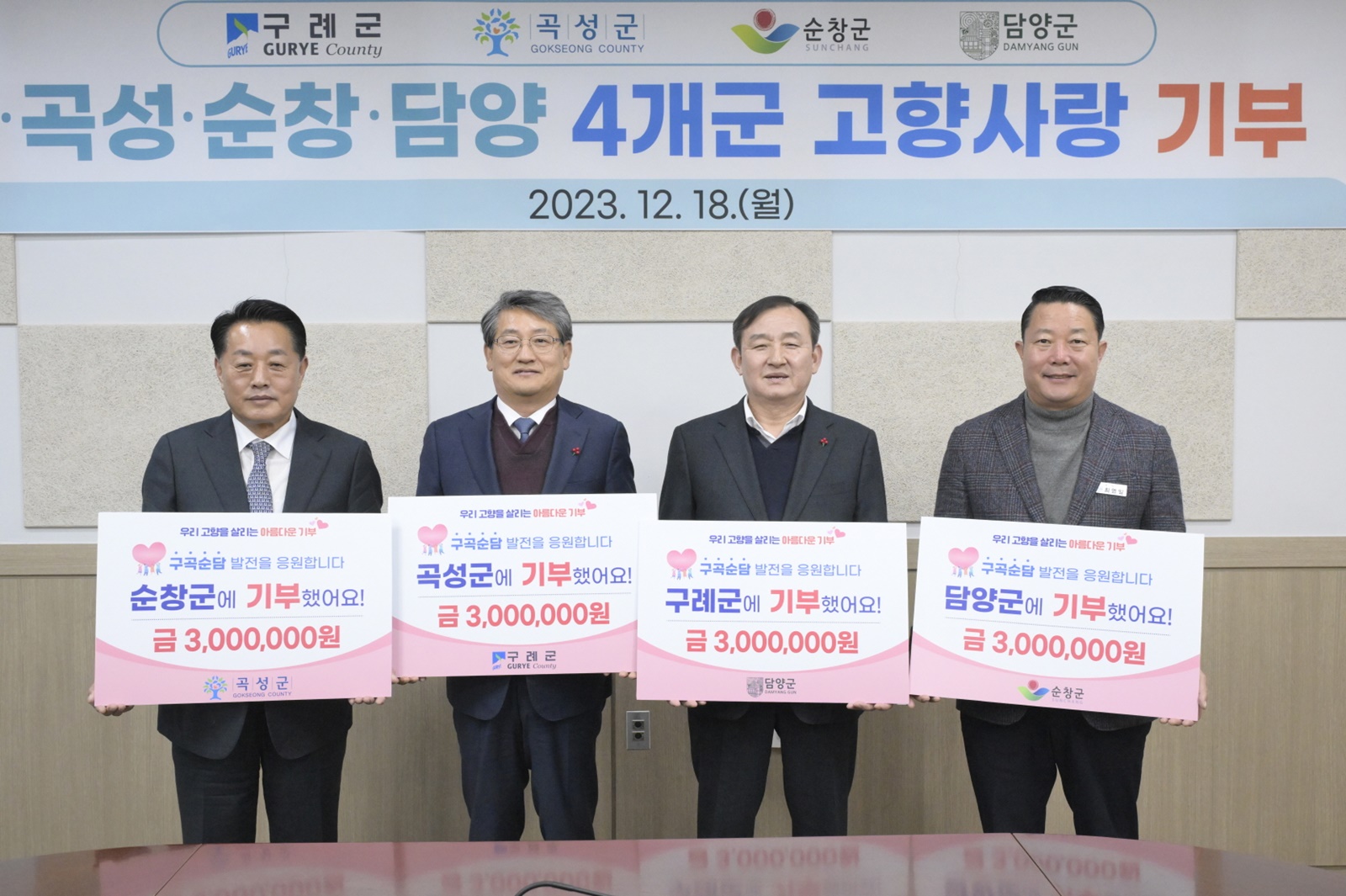 이어서 고향사랑기부제 시행 첫해, 향후 성공적인 정착과 기부문화 활성화, 구곡순담 4개군의 상생협력을 위해 고향사랑기부금을 순창군은 담양군에, 담양군은 구례군에, 구례군은 곡성군에, 곡성군은 순창군에 4개군 지역 간 기부했다.