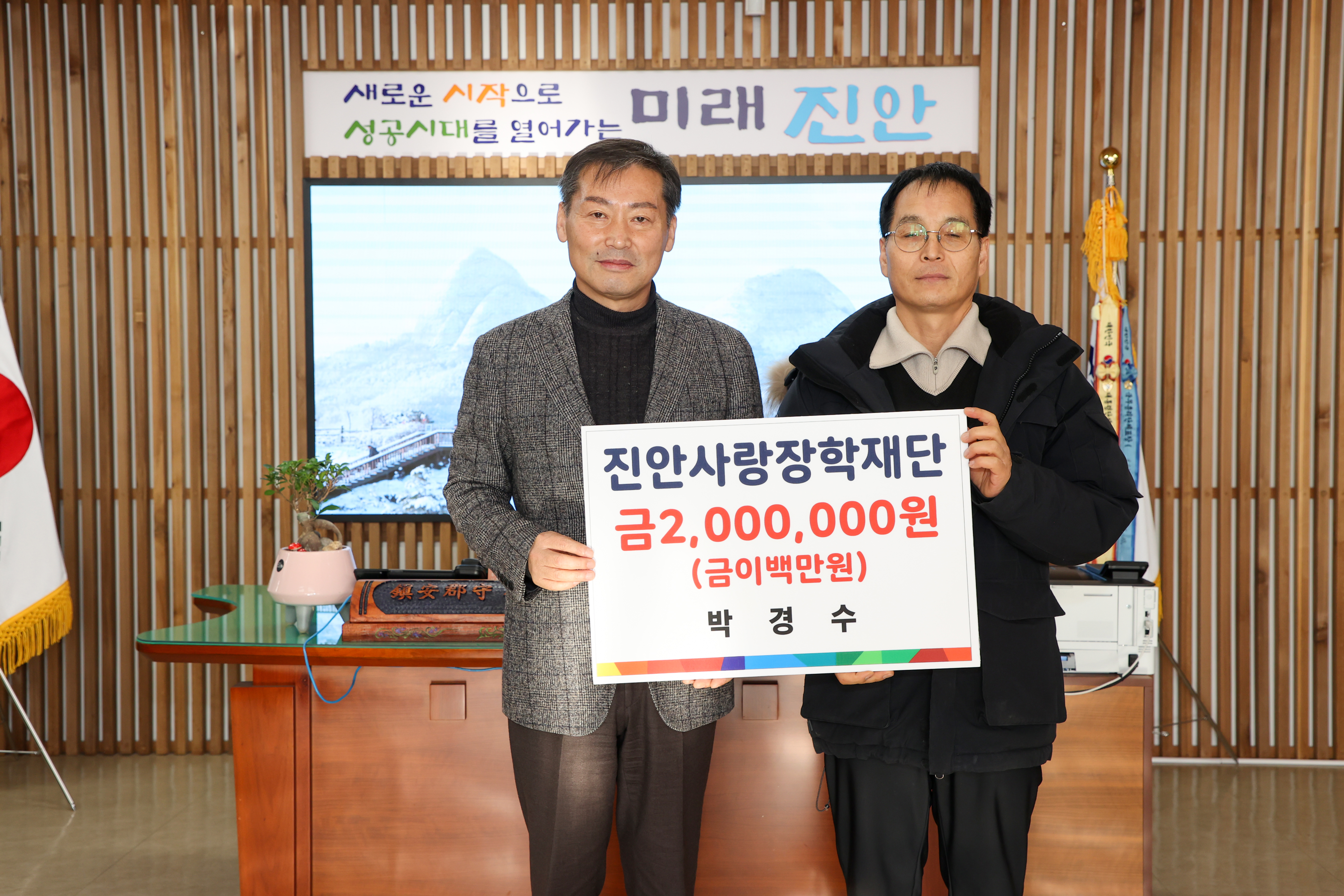 [진안=뉴전북]진안사랑장학재단(이사장 전춘성)은 21일 부귀면에서 수희농장을 운영하는 박경수 대표가 장학금 2백만원을 기부했다고 밝혔다.