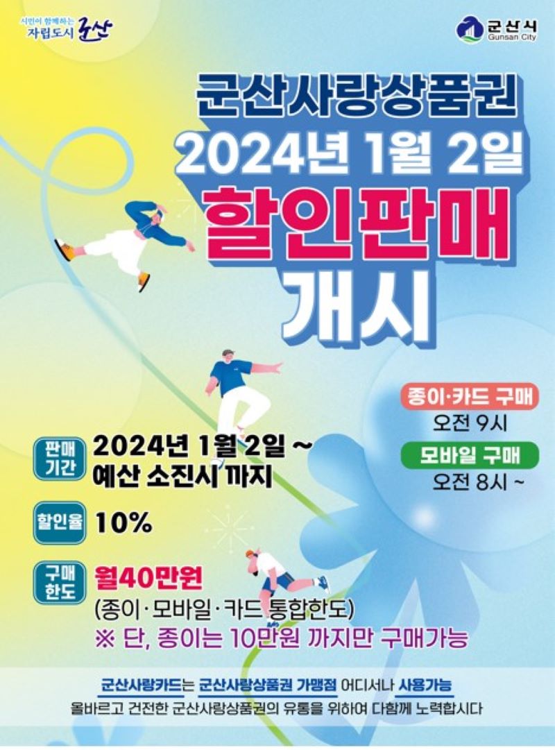 [군산=뉴전북] 군산시는 군산사랑상품권 판매를 4개 금융기관(농협·전북은행·새마을금고·신협) 74개 지점에서 2024년 1월 2일 오전 9시부터 (모바일은 오전 8시) 시작한다고 밝혔다.