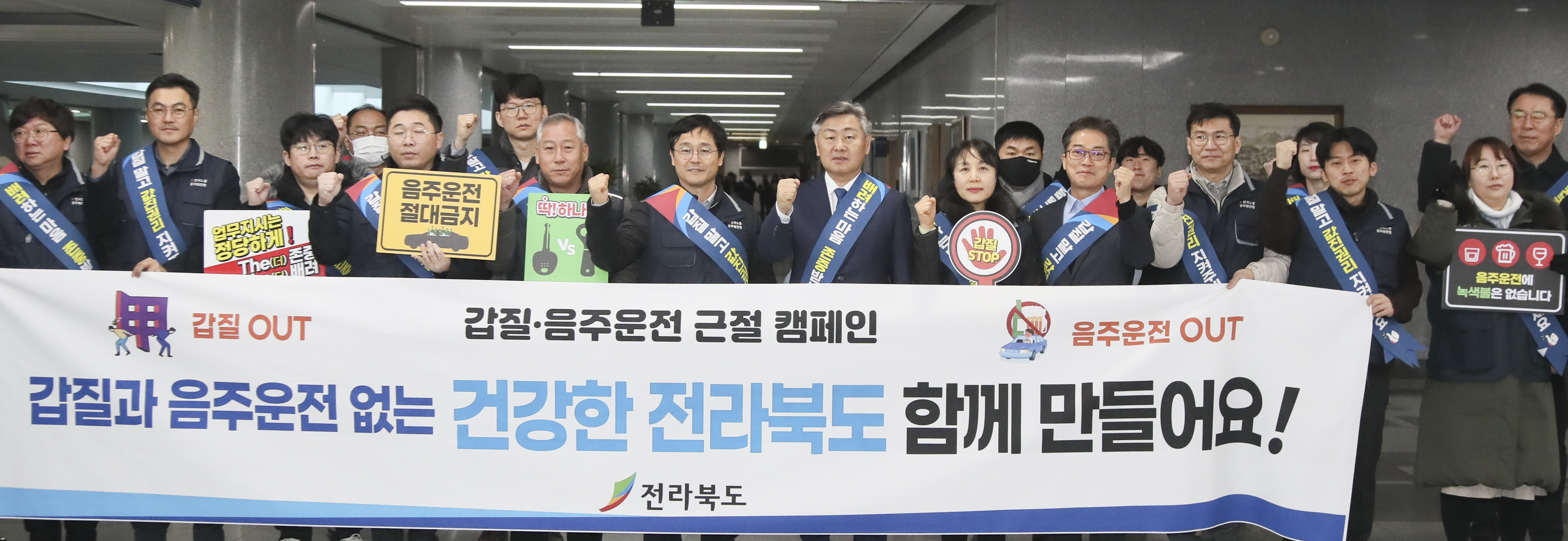 김관영 도지사도 이날 출근길에 ‘갑질・음주운전 절대 하지 않기 다짐 서약’을 직접 실천하고 직원들과 ‘직장 내 갑질 타파, 음주운전은 패가망신’ 구호를 함께 외치는 등 갑질 및 음주운전 예방을 위한 캠페인에 동참했다.