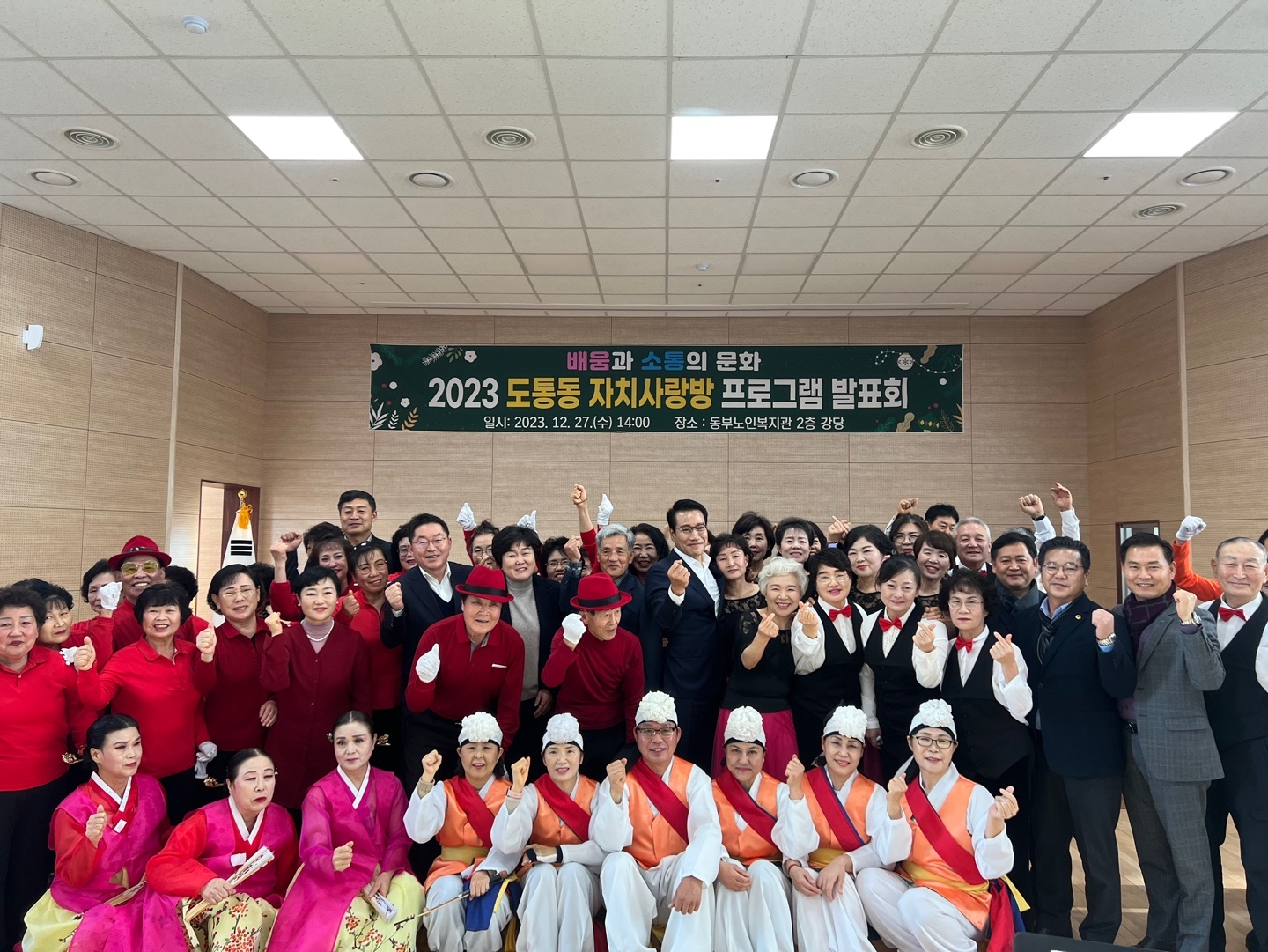 2층 강당에서 남원시민, 자치사랑방수강생,주민자치위원, 지역주민, 자생단체 회원등 200여명이 참석한 가운데 2023 도통동 치사랑방 프로그램 발표회를 성황리에 개최하였다.