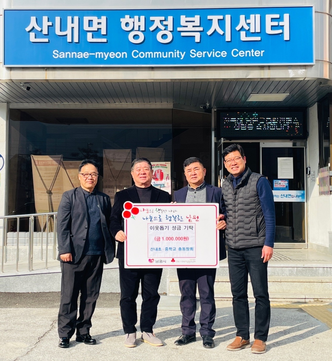 기부에 참여하신 산내초·중학교 총동창회 최재식 회장은 “여러 사유로 어려움을 겪는 이웃들에게 조금이나마 도움이 되고 나눔과 배려의 문화가 확산되길 바라는 마음으로 성금을 기탁 하게 됐다.” 며 “우리 이웃들이 용기와 따뜻한 정을 느낄 수 있었으면 좋겠다.” 고 말했다.