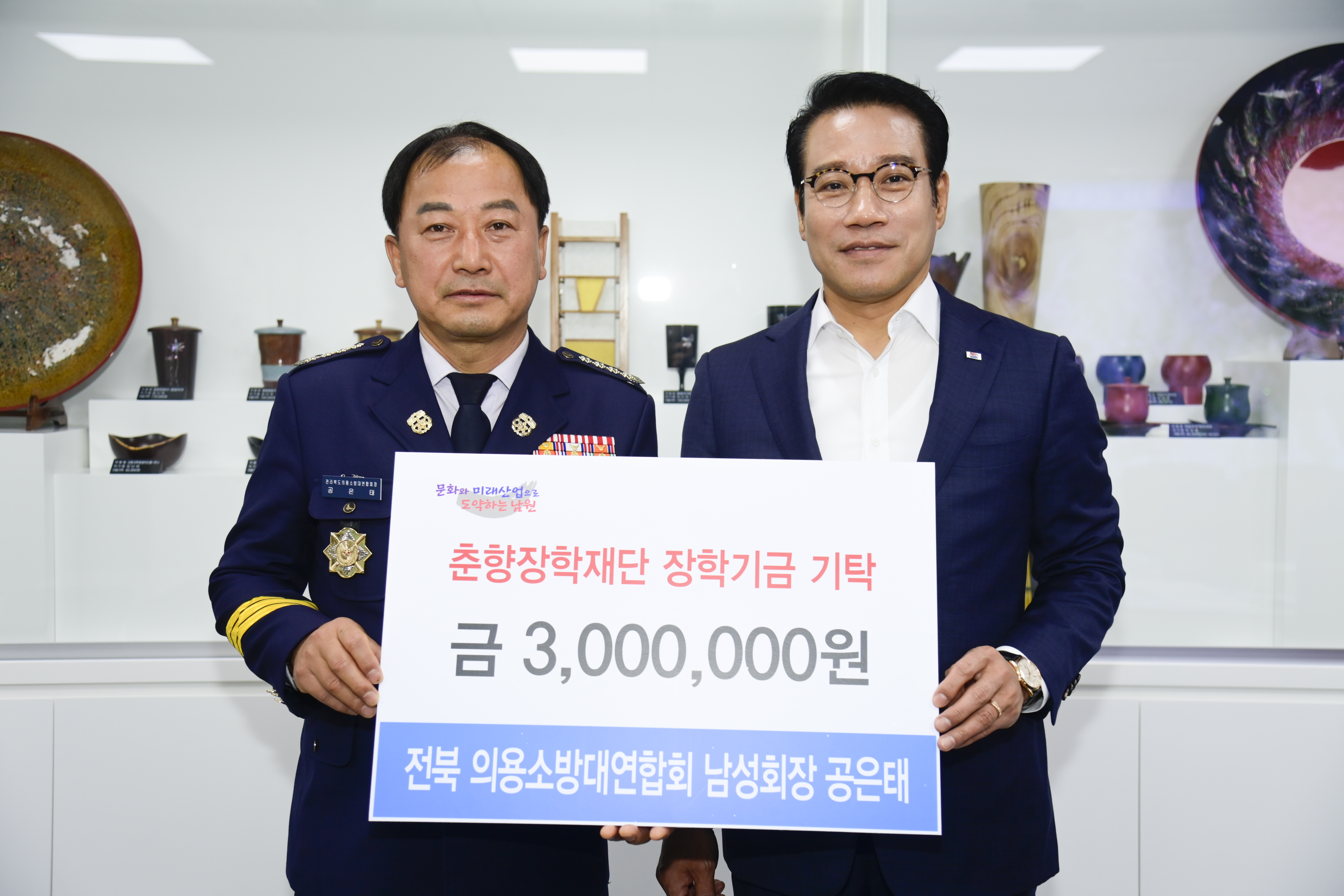 [남원=뉴전북] 지난 4일 전북 의용소방대연합회 공은태 남성회장은 인재육성 장학금 300만원을 춘향장학재단에 전달했다.