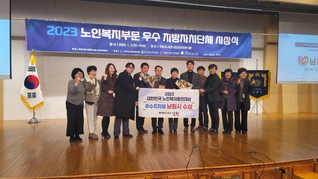 [남원=뉴전북] 남원시는 지난 1. 3.(수) 국회도서관에서 열린 2023 대한민국 노인복지증진대상에서 노인복지부문 지자체 심사결과 우수 지방자치단체로 선정되었다.