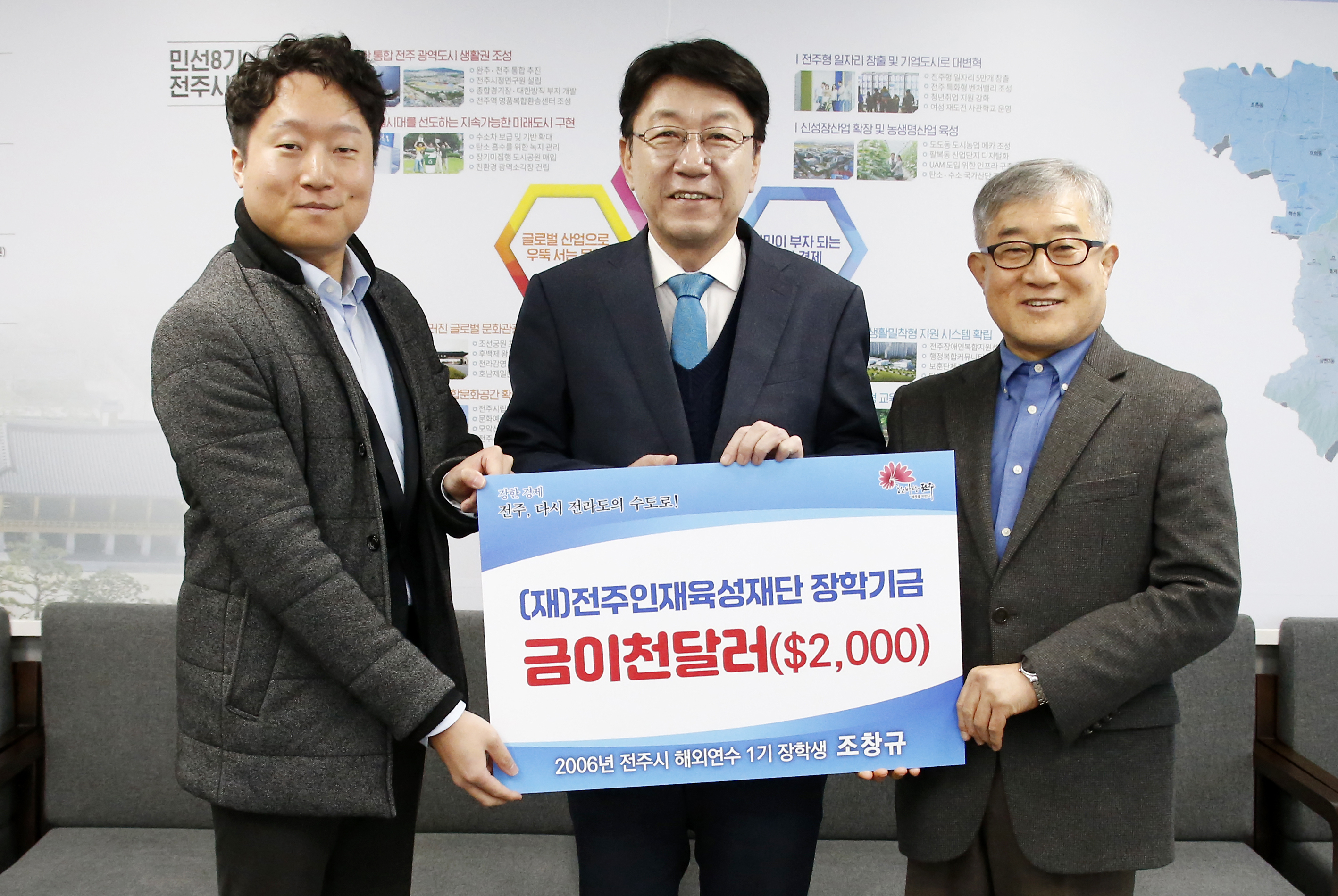장학기금을 기탁받은 우범기 전주시장은 “전주인재육성재단 장학생이 해외에서 대한민국 전주의 자랑스런 인재로 성장하고, 후배들을 위해 꾸준히 장학기금을 후원해주신 데 감사한 마음”이라며 “제2, 제3의 조창규가 나오도록 글로벌 인재 양성에 힘쓰겠다”고 말했다.