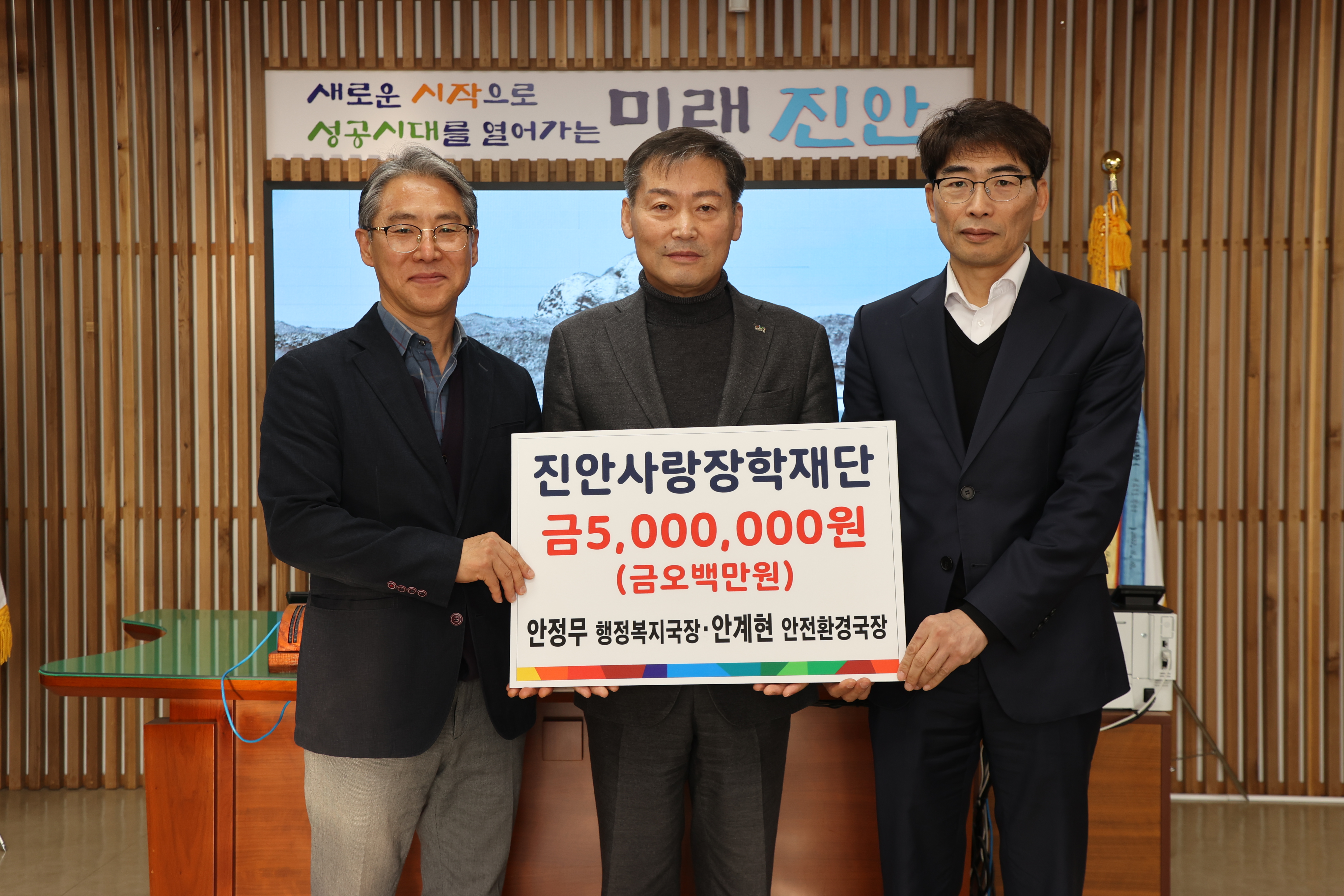 [진안=뉴전북]진안사랑장학재단(이사장 전춘성)은 진안군청 안정무 행정복지국장과 안계현 안전환경국장이 장학금 5백만원을 전달했다고 15일 밝혔다.