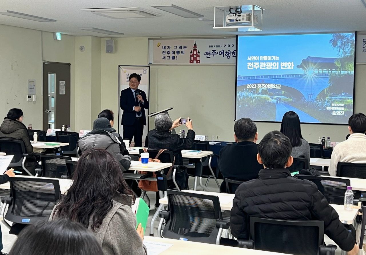 시는 18일 전주도시혁신센터 교육장에서 송영진 전주시의회 문화경제위원장과 전주여행학교 수료생 등 40여 명이 참석한 가운데 ‘시민 중심의 지역관광 육성’을 목표로 추진한 ‘2023년 전주여행학교’의 최종성과 공유회를 가졌다.