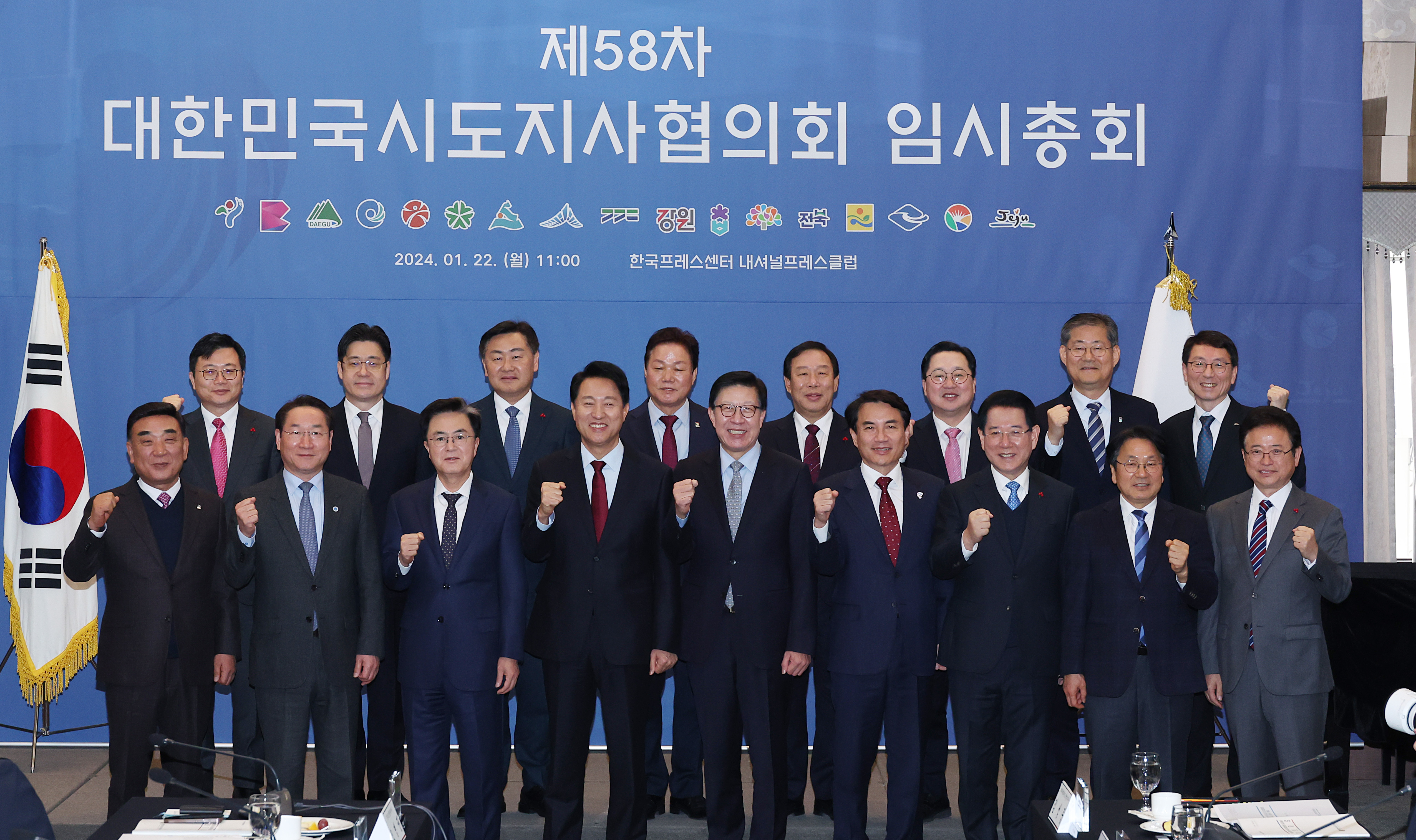 (첫번째열 좌측부터 김두겸 울산광역시장, 유정복 인천광역시장, 김태흠 충남도지사, 오세훈 서울특별시장, 박형준 (대한민국시도지사협의회회장)부산광역시장, 김진태 강원특별자치도지사, 김영록 전남도지사, 강기정 광주광역시장, 이철우 경북도지사 순 뒷열 좌측부터 김선조 대구광역시 행정부지사, 오병권 경기행정1부지사, 김관영 전북특별자치도지사, 박완수 경남도지사, 최민호 세종특별자치시장, 이장우 대전광역시장, 정선용 충북행정부지사, 김성중 제주특별지치도 행정부지