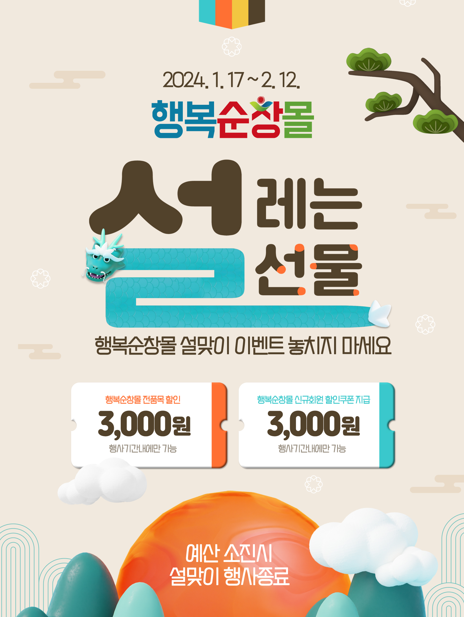 이번 행사는 오는 2월 12일까지 진행되며, 기간 동안 쇼핑몰 등록 전 품목 3,000원 할인과 신규회원 가입 시 쇼핑몰 상품을 구매할 수 있는 3,000원 쿠폰을 지급한다. 단, 할인행사는 예산 소진 시 조기에 종료될 수 있다.