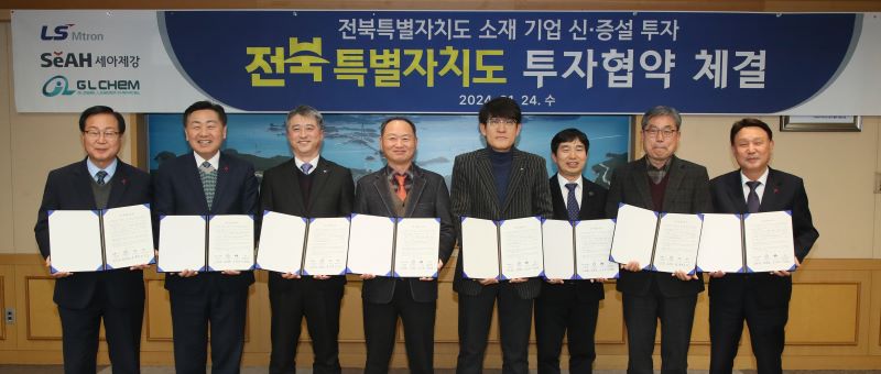 [군산=뉴전북] 전북 특별자치도는 대․중소기업 신․증설 투자를 위해 도내 대기업인 LS엠트론, 세아제강을 비롯해 지엘켐과 추가 투자를 위한 협약을 체결했다고 밝혔다.