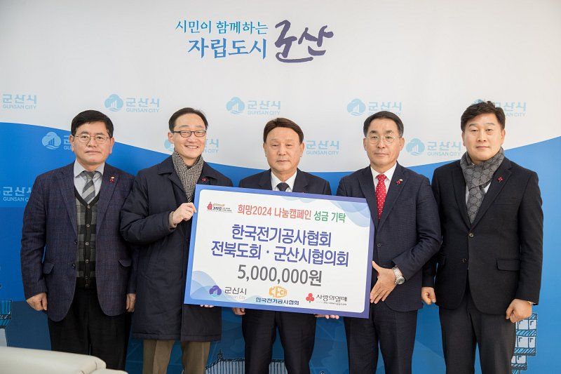 [군산=뉴전북]한국전기공사협회 전라북도회(회장 양관식)와 군산시 협의회(회장 전율용)에서 지난 25일 희망 2024 나눔 캠페인 참여하여 어려운 이웃을 위해 성금 500만 원을 전달했다고 밝혔다.