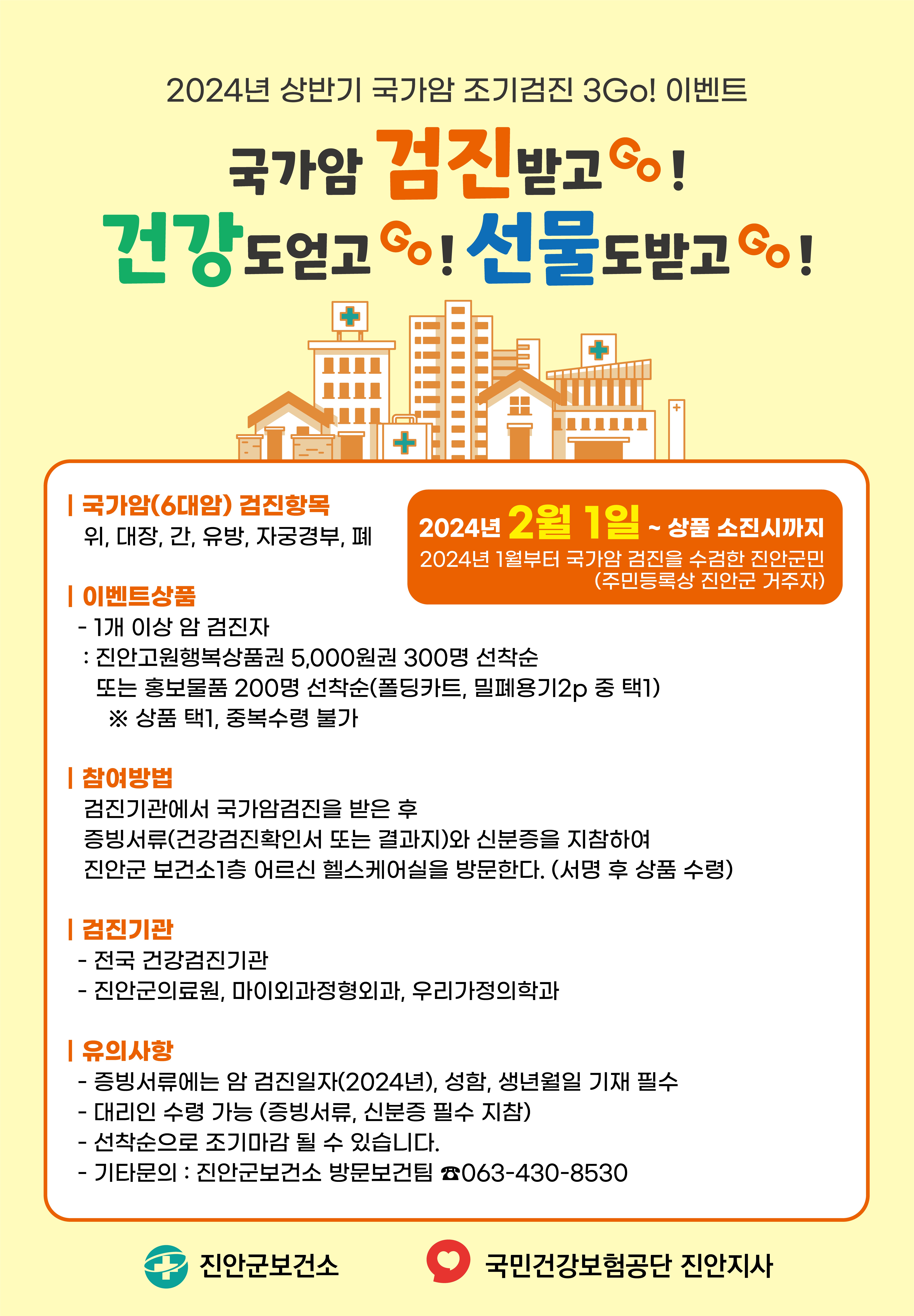[진안군=뉴전북]진안군은 지역주민의 국가암 검진 수검률 향상을 위해 국민건강보험공단과 함께 국가암 조기검진 이벤트인 ‘2024년 상반기 국가암 조기검진 3Go! 이벤트’를 실시한다고 26일 밝혔다.