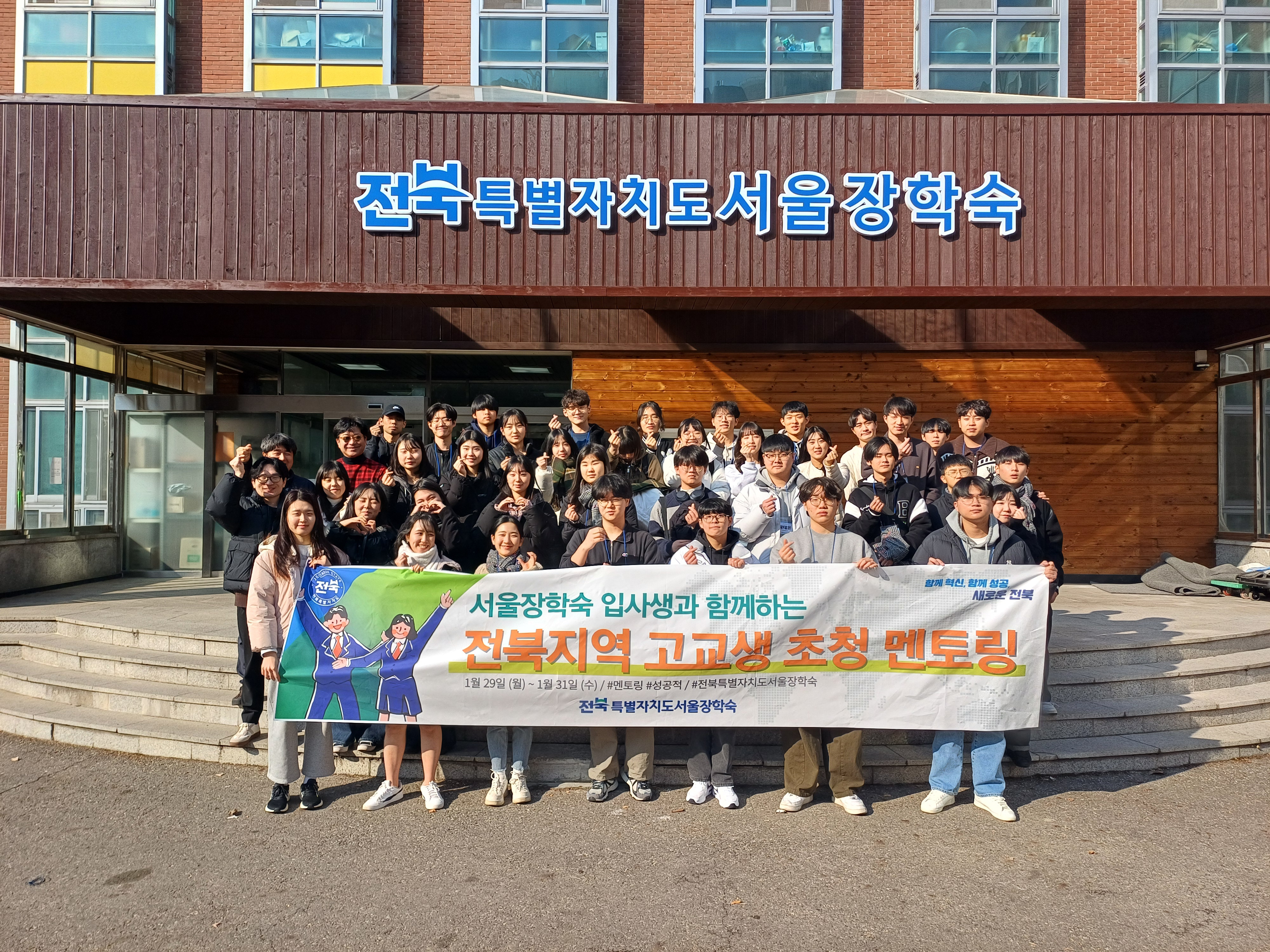 [도정=뉴전북] 전북특별자치도서울장학숙(관장 김관수)은 1. 29.(월) ~ 1. 31.(수) 3일간, 도내 14개 시‧군 고교생(1학년생 22명 – 남학생 10명, 여학생 12명)을 초청, 입사생과 함께 하는 멘토링을 진행하여 입사생들이 애향심을 갖게 하는 등 적극적인 지역봉사활동을 추진했다.
