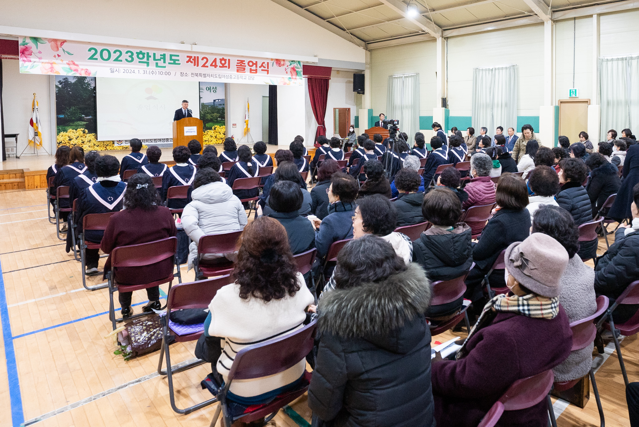 졸업식에는 국주영은 도의회 의장, 박주용 부교육감 등이 참석해 만학도들을 축하하고, 김관영 도지사는 영상으로 축하 인사를 전했다.