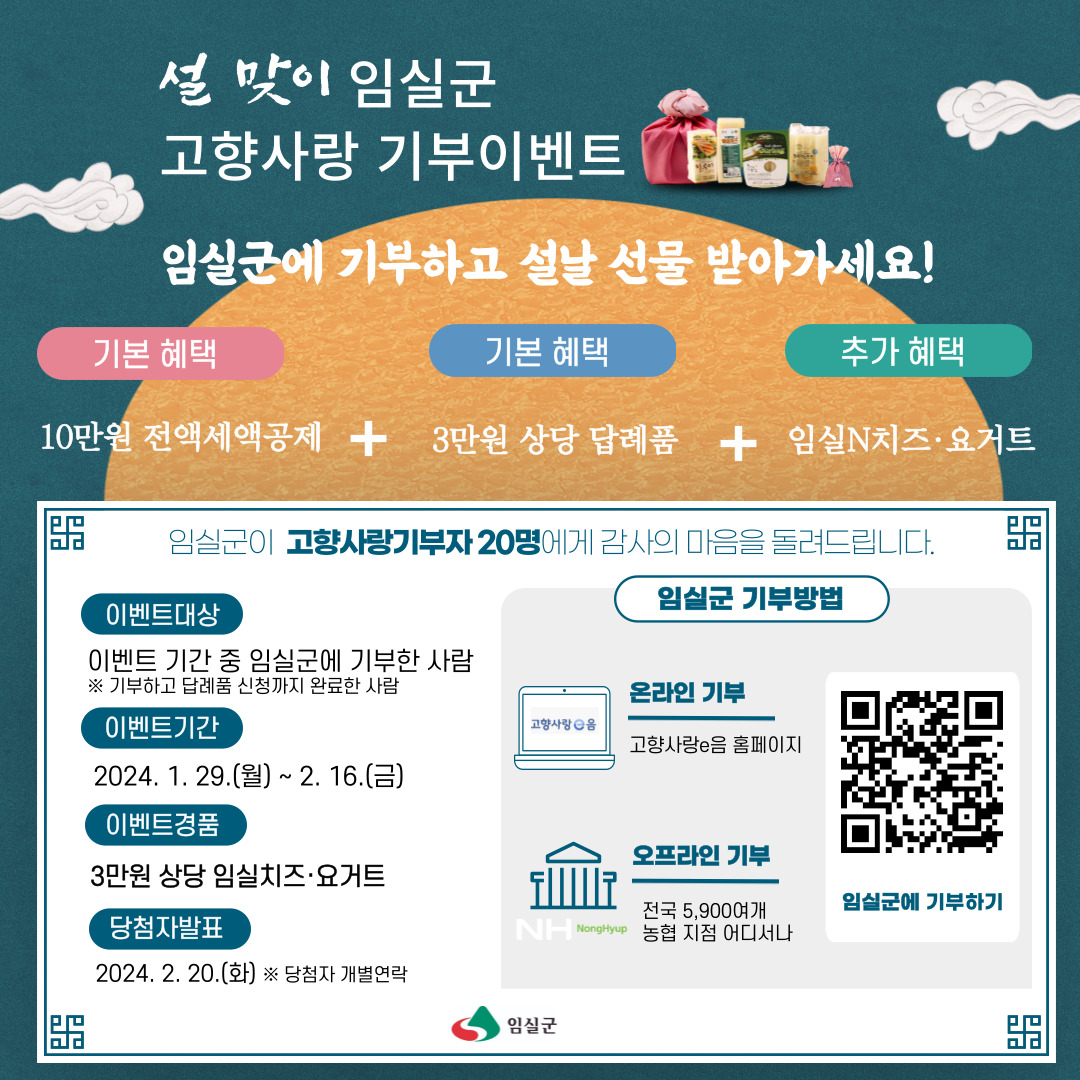 - 설 명절맞이 고향사랑기부 감사이벤트, 1월 29일부터 2월 16일까지,10만원 이상 기부 자동 응모, 20명 추첨, 당첨 시 임실치즈 제공