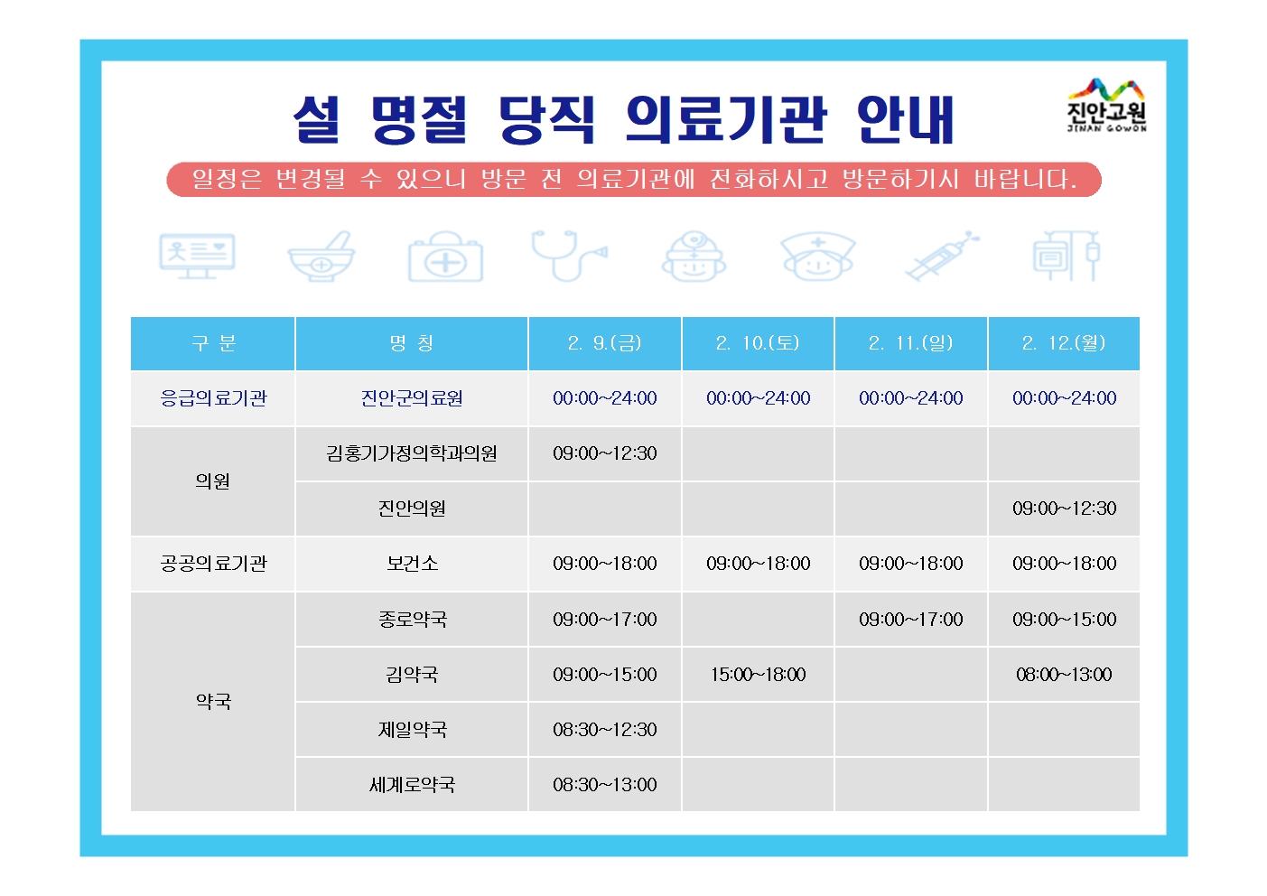 이번 설 연휴기간 비상 진료기관은 지역 응급 의료기관인 진안군의료원과 관내의료기관 3개소, 휴일 지킴이 약국 4개소, 보건소 1개소에서 일자별·시간대별로 지정·운영되며 그 밖에 편의점 등 7개소의 의약품판매업소에서도 해열제 등 안전상비의약품을 구입할 수 있도록 철저히 대비할 예정이다.