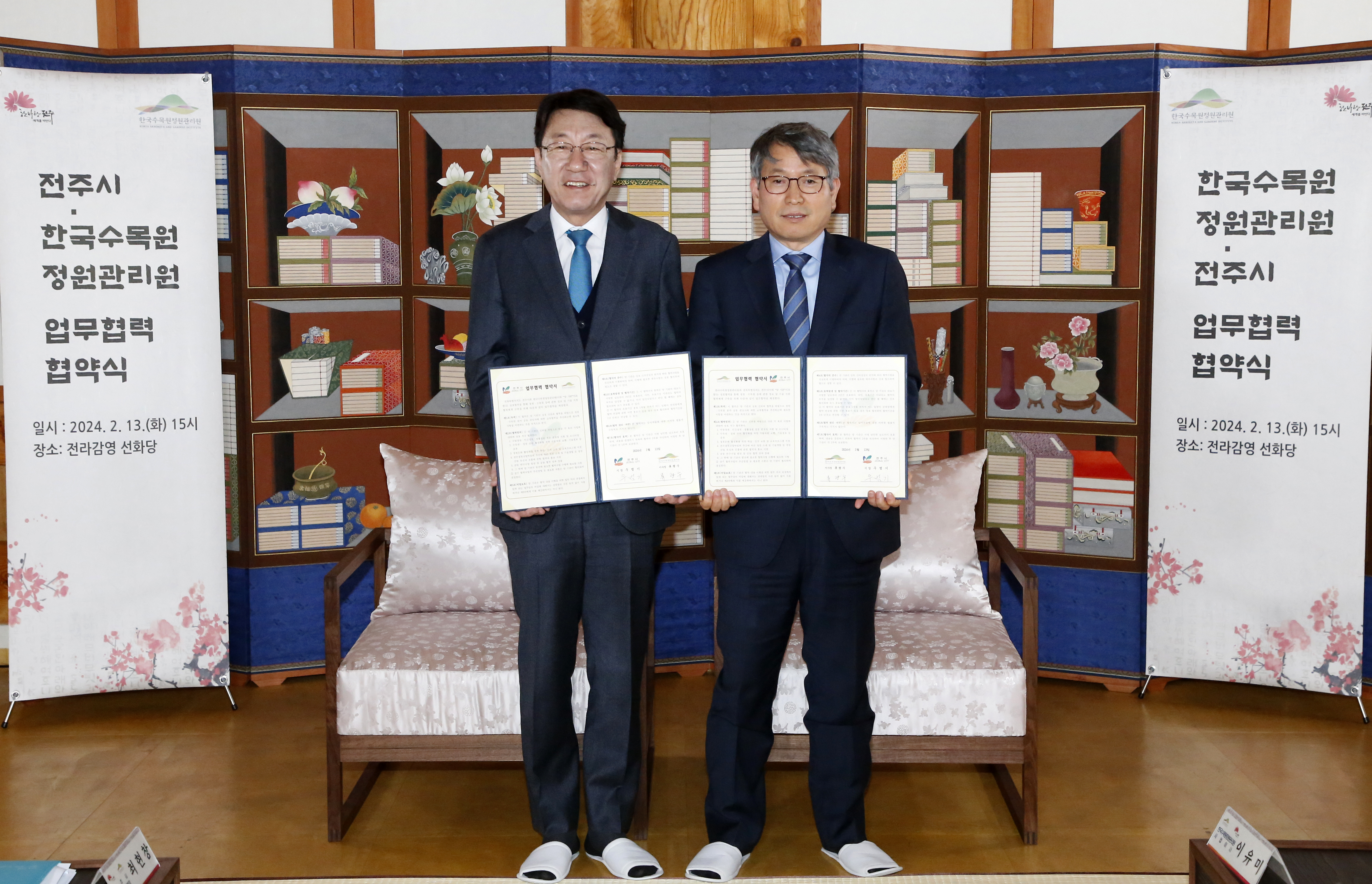 [전주=뉴전북] 전주시와 한국수목원정원관리원은 13일 전라감영 선화당에서 우범기 전주시장과 류광수 한국수목정원관리원 이사장 등 양 기관 관계자 10여 명이 참석한 가운데 ‘지속 가능한 수목원 및 정원 가치 확산을 위한 업무 협약’을 체결했다.