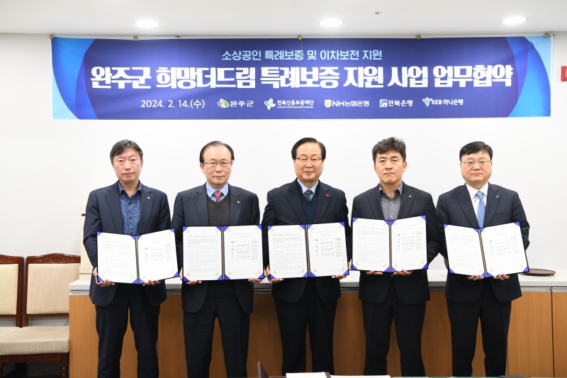 지난 14일 완주군은 유희태 완주군수, 전북신용보증재단 한종관 이사장, NH농협은행 김대호 전주완주시군지부장, 전북은행 서두원 부행장, 하나은행 우승구 광주전북영업본부장이 참석한 가운데 특례보증 사업 협약식을 가졌다.