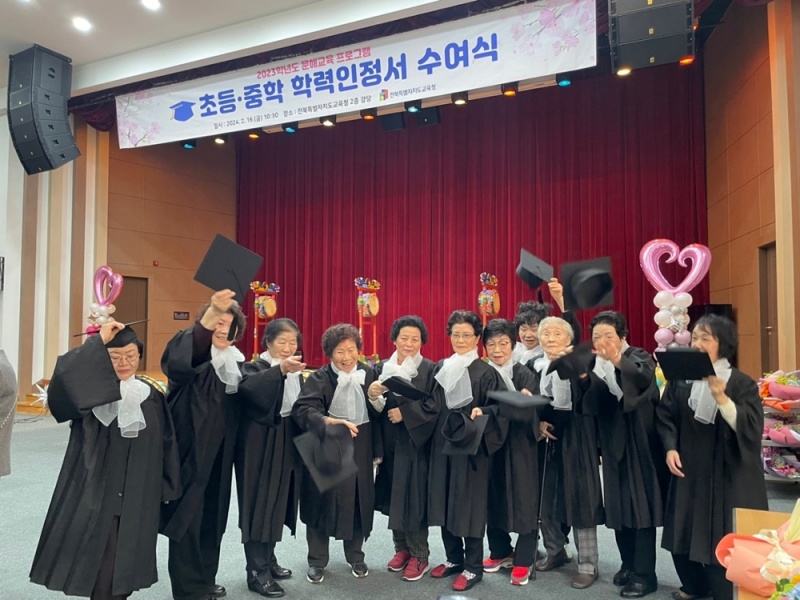 [김제=뉴전북] 뒤늦게 공부를 시작한 15명이 성인문해교육 초등학력인정과정 이수로 초등학력을 인정받았다.