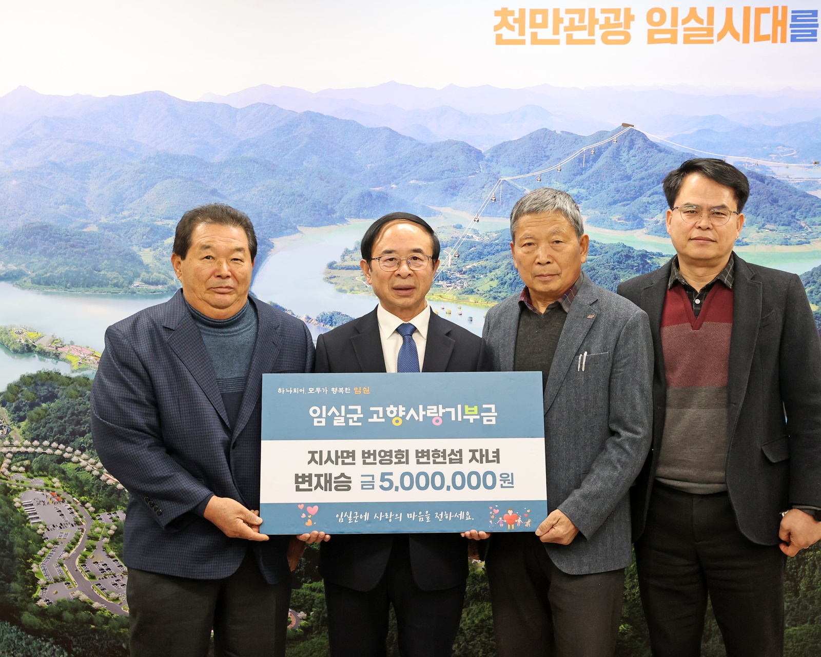 심 민 군수는 “임실에 고향 사랑의 마음을 전해주신 변재승 씨와 대신 참석하여 자리를 빛내 주신 변현섭 씨에게 감사드린다”며 “보내주신 기부금은 임실군민 복리 증진 및 임실 발전을 위해 소중하게 사용하겠다”라고 말했다.