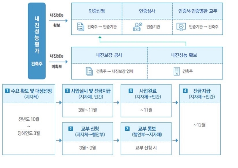 이번 지원사업은 국비10%, 지방비 10%, 자부담80%로 실시되며 내진보강공사에 소요되는 비용의 20%(최대 5억 원)을 지원한다.