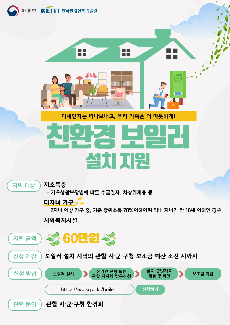 조병천 환경정책과장은 “대기환경개선에 도움이 되고 에너지 절감도 되는 친환경 보일러 설치 지원 사업에 시민들의 많은 참여를 바란다.”고 전했다.